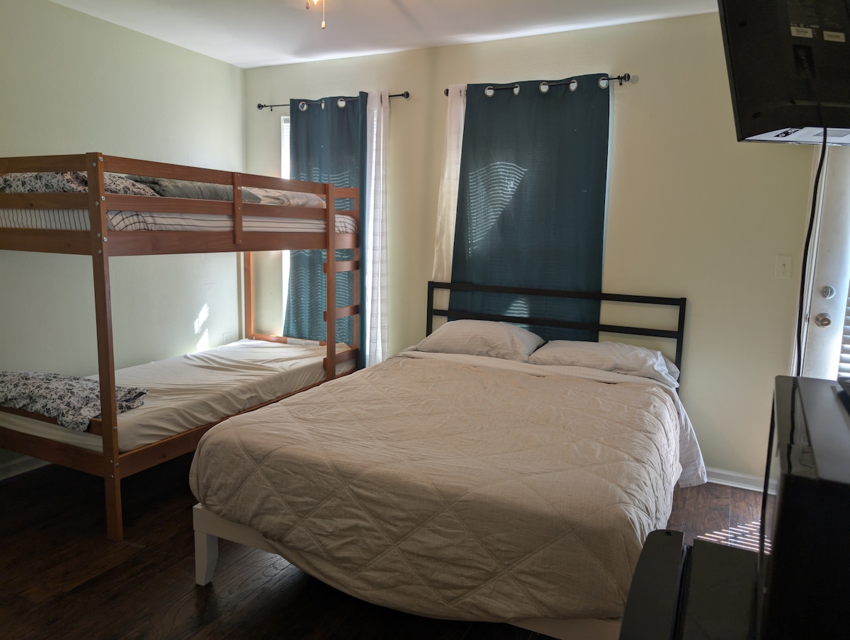Relax and play in this spacious 3BR/2BA Ranch-style gem—1,700 sq. ft. of comfort and fun! Enjoy king and queen beds, Smart TVs in every room, and a fully stocked kitchen. The large screened patio is perfect rain or shine, complete with Ping Pong, giant Jenga, and space to unwind. Fast Wi-Fi, tons of games, and a big fenced yard for your pup make this the ultimate getaway in the city!