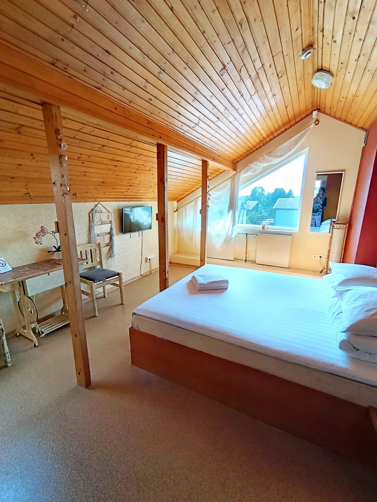 Deluxe double room with modern, ensuite bathroom in a medieval building. The room has a special, authentic atmosphere, wooden floors, thick brick walls, view of the Old Town. It is on the 3rd floor (must take stairs) therefore very quiet and calm.