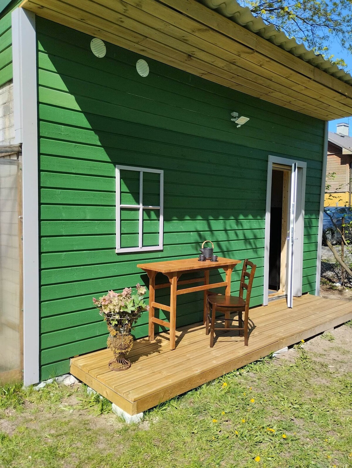 Visit renovated Soviet time garage to experience Nõmme in a new way. Open kitchen, living room with 1 sofa bed and an additional mattress (both for 2), bathroom, little terrace and big yard in a quiet area. Washing machine and dryer make it simple to enjoy your vacation with a small family. Find out the secret cellar shop with home made jams and conserves, enjoy coffee or handpicked herbal tea to get contact with Estonian nature. Shops, pubs, train/bus stops, cycle tracks - 5 min walk