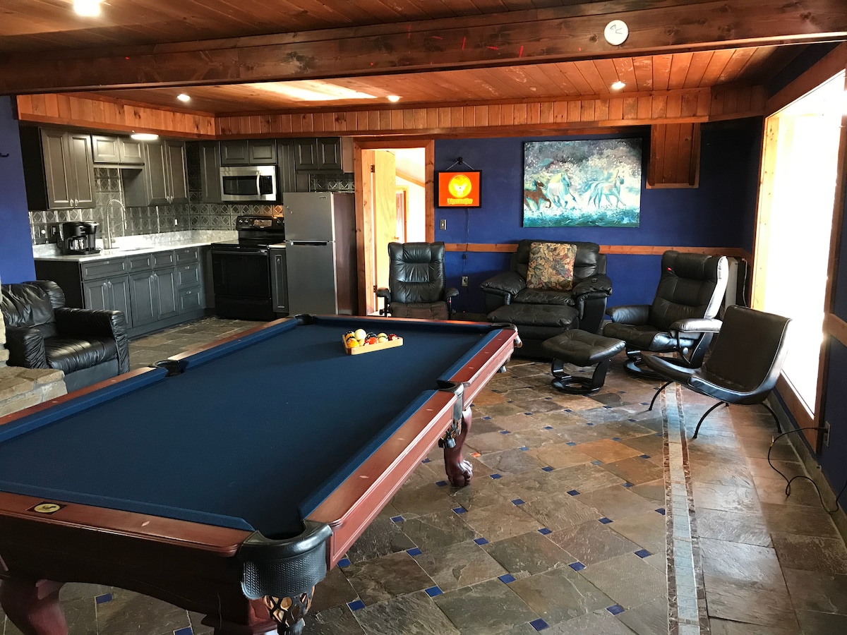 This is Lower Party Level of the A-frame. Amazing views out every window. KING VIBRATION bed. Bathroom-shower. New full kitchen airfry range, gas grill, Kurig k/ground. Super large Saltwater Hot Tub (hot tub is shared). Hiking trails are all around. The Bars and restaurants walkable. 70 inch tv, 44 inch tv. and 9 foot pool table. 2 adult guest only! pet fee. additional infant ok.. Upstairs house rents separate. Goats right outside! NO dogs over 50 lbs. EV slow charge plug by door on post