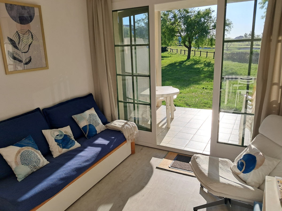 Idéal vacances ou escapade ressourçante, appartement cosy dans un cadre privilégié pour 5 pers dont 4 adultes maxi au cœur d’un village vacances. Vous apprécierez la terrasse avec vue imprenable sur le golf et l’océan. Situé au 1 étage d’un petit immeuble, l’appartement a une chambre avec un lit double et un lit simple superposé, dans le salon un autre lit double escamotable, cuisine équipée. Accès piscine pour 5 personnes à la piscine de la résidence de mai à fin septembre. Proximité commerces