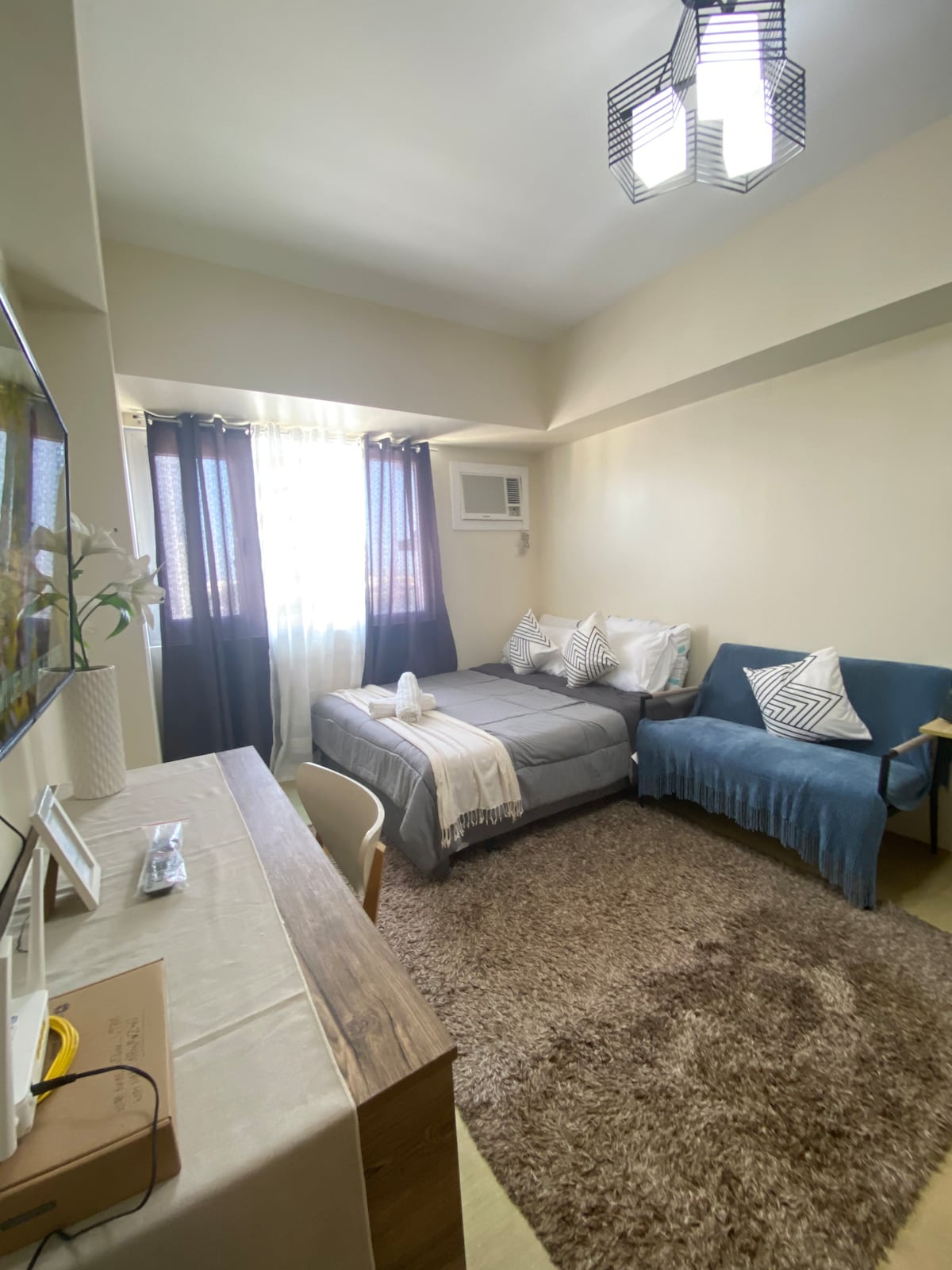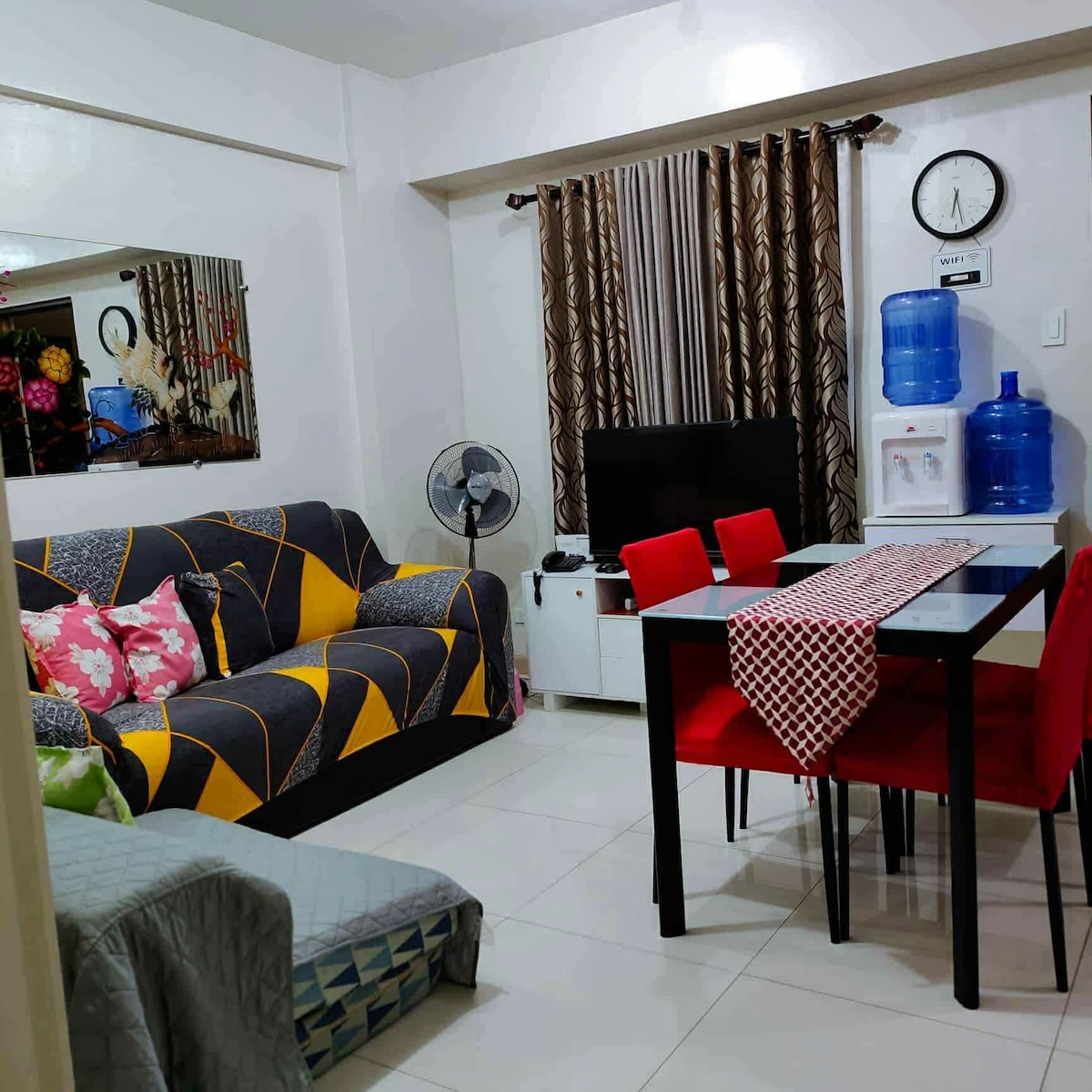 Relax and unwind in this comfortable and spacious one-bedroom condo in the heart of Davao City. Enjoy the stylish Condo and amenities it comes with it: ✅ free Car Parking ✅ unlimited WiFi ✅ 2 smart Tv with Netflix ✅ Washer and Dryer ✅ Cozy Bedroom w/ Queen size Bed ✅ Office desk w/Chair ✅ hardwood Dinning table and Chairs ✅ complete kitchen equipment ✅ microwave, water dispenser, Rice Cooker, water heater And More.