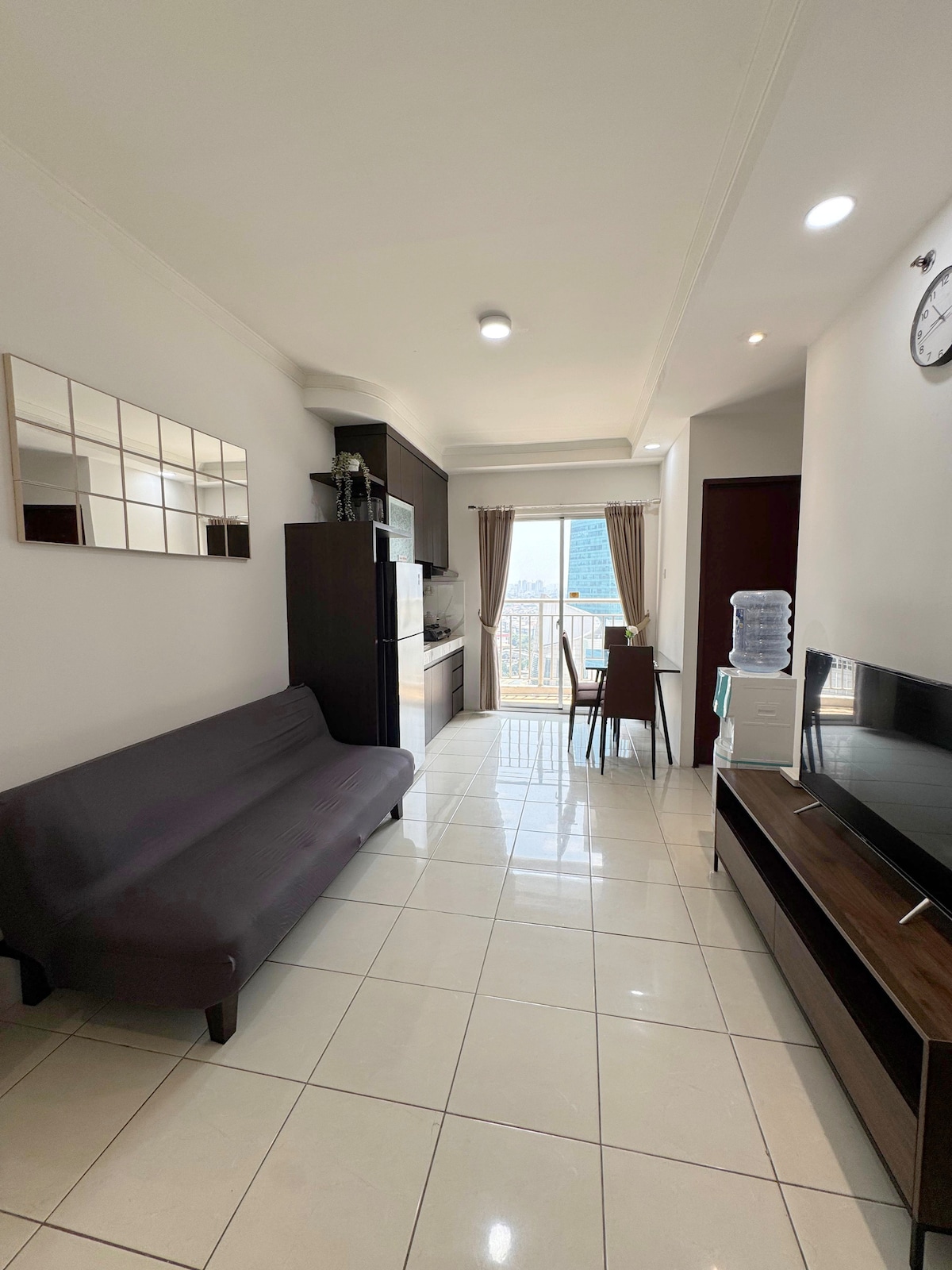 A spacious, cozy 1-bedroom apartment with a living room and balcony at Citralake Suites, West Jakarta's ideal lakeside getaway. Conveniently located just minutes from the Airport, PIK, Puri Indah and Sunset Avenue, it’s easy to explore the city. Step outside and you’re just a 1-min walk from Ciffest, a lively dining area with plenty of food options, supermarkets and ATMs. Our 1 BR unit provides a luxurious and comfortable space for up to 3 guests, with a kitchenette, Free Wi-Fi, and Netflix.
