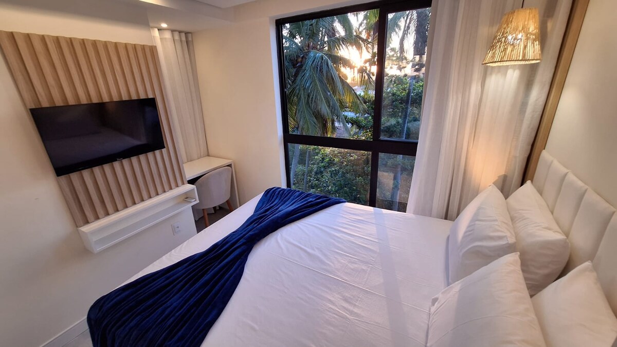 Flat moderno, novo, equipado com cama, mesa, e banho, ideal para casais, podendo receber 4 hóspedes (1 cama quenn, 1 sofá cama com 1,65 mt, 1 colchonete) todos com enxoval completo. TV 43 pol, Ar-condicionado, Wi-Fi, cozinha equipada, portaria 24h e estacionamento. Rooftop com vista pro mar e piscina de borda infinita. Taxa única de limpeza: R$ 100. Localização excelente, perto de Carneiros, Acquaventura, e igrejinha velha de Tamandaré, Reserve com segurança