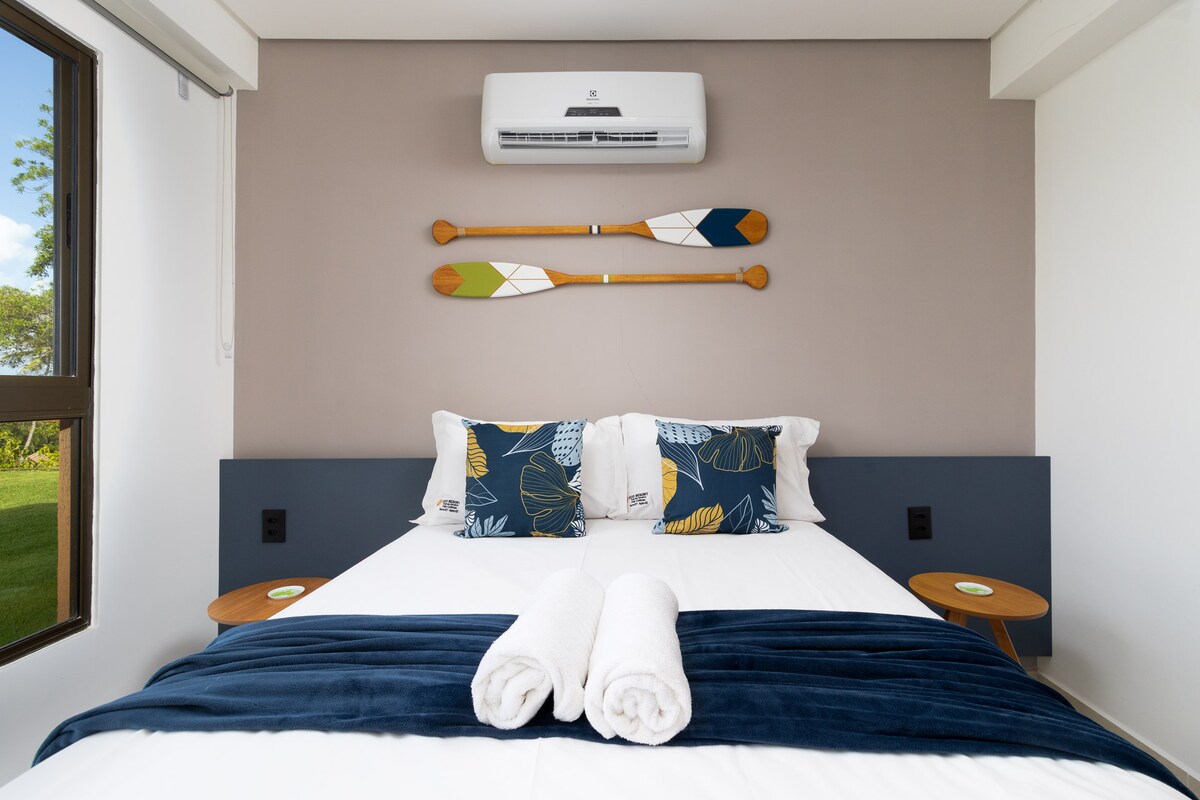 Relaxe com toda a família Portas corrediças que permitem transformar o espaço em 2 quartos garantindo mais privacidade; - Possui 1 cama queen para os amantes do conforto e espaço, armário e um ar condicionado Split; - Possui 1 bicama solteirão com espumas M33 , TV Smart. - Chuveiro quente à gás; - Varanda privativa com mesa dobrável que permite mais espaço e possibilita a armação de uma rede (disponível), frigobar e vista para o jardim. - Rede de proteção para criança