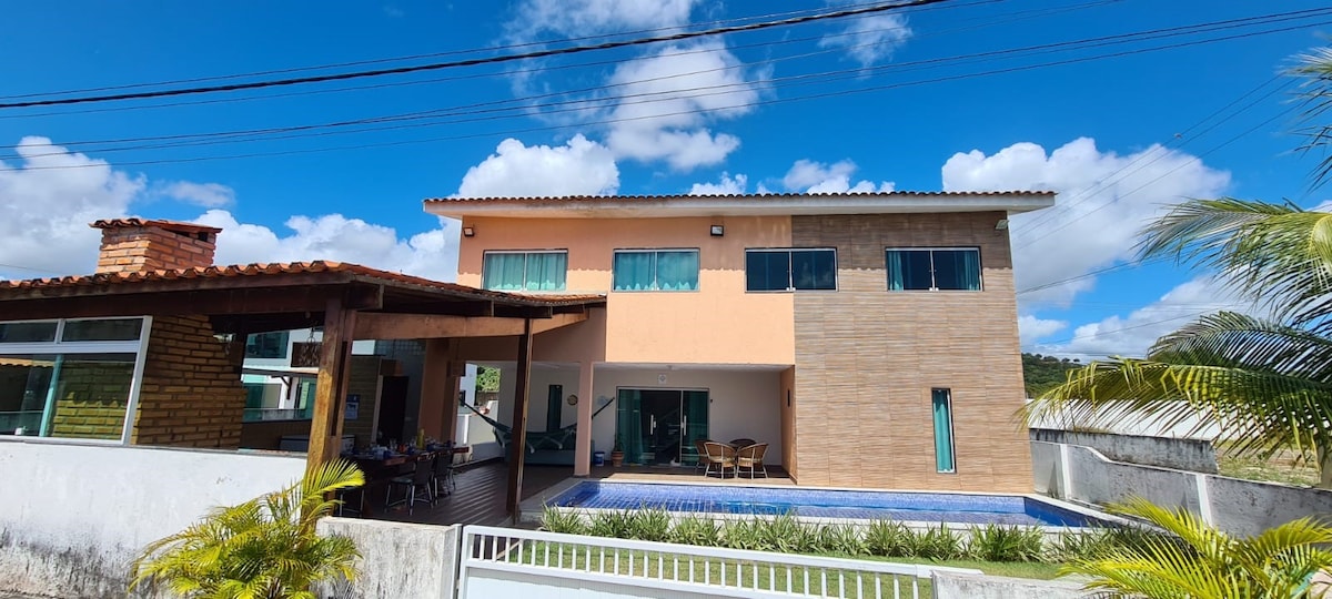 A casa: São 03 suítes, uma térrea e duas no primeiro andar e um lavabo. Ar condicionado e TV em todas as suítes e na sala. Sala de estar/jantar, cozinha completa e varandas no térreo e no primeiro andar. Possui também piscina privativa com deck e 02 garagens privativas. O Condomínio dispõe de área de lazer completa com piscinas, quadras poliesportivas, academia, área infantil, restaurante/bar e segurança 24h. O mar na frente do condomínio é muito calmo, com área reservada para banhistas.