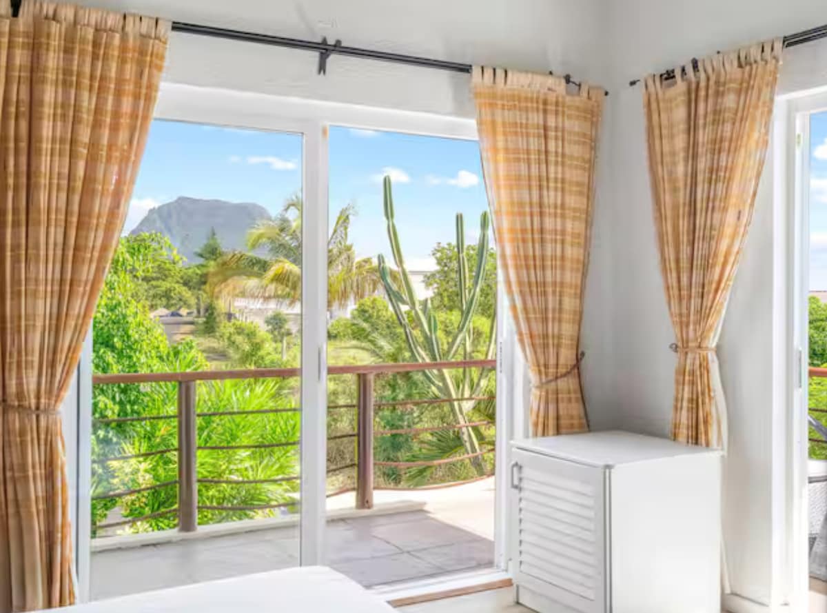 Mountain views are for the birds! ;-) Centrally located, 350m from a well stocked supermarket, and 3 minutes drive to the beach, this cosy home invites you to relax or go out to a wide ranging choice of restaurants nearby. In a tranquil dead end, surrounded by greenery, enjoy sitting on a wooden terrace, overlooking the common pool or relax on the 1st floor balcony while watching stunning tropical sunsets and sea views, overlooking Le Morne. Cleaning service three times a week included