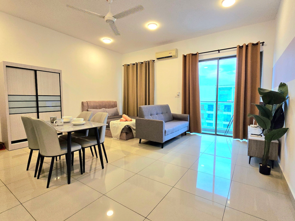 Cozy & Spacious Apartment with Modern Amenities. Our unit is on the 18th floor, offering beautiful city & mountain views of Puchong & accommodating up to 11 guests. Perfect for business travelers, family staycations & parents looking to bond with their little ones in a relaxing environment. Conveniently situated in the heart of Puchong, it provides easy access to restaurants, a cinema, convenience stores, hypermarkets, LRT, IOI Mall, Sunway Pyramid, Sunway Lagoon, Pavilion Bukit Jalil & more.