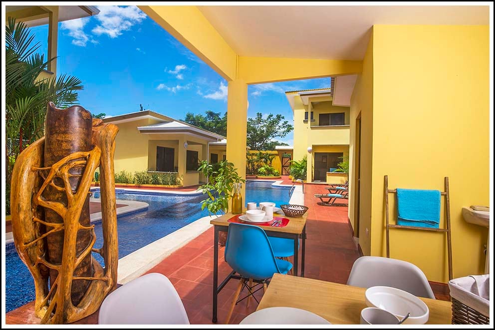 This peaceful oasis is minutes walk to town and beach. This 2 BR / 1 BA jewel is nestled in nature surrounded by trees. Unit #3 is located on the ground level facing the large pool and has a covered balcony to enjoy outdoor living, relax and take in the views. Fantastic restaurants, shopping and the local grocery market are just around the corner. This unique gated property combines all the best that Tamarindo has to offer to make your holiday vacation Pura Vida.......See you soon!
