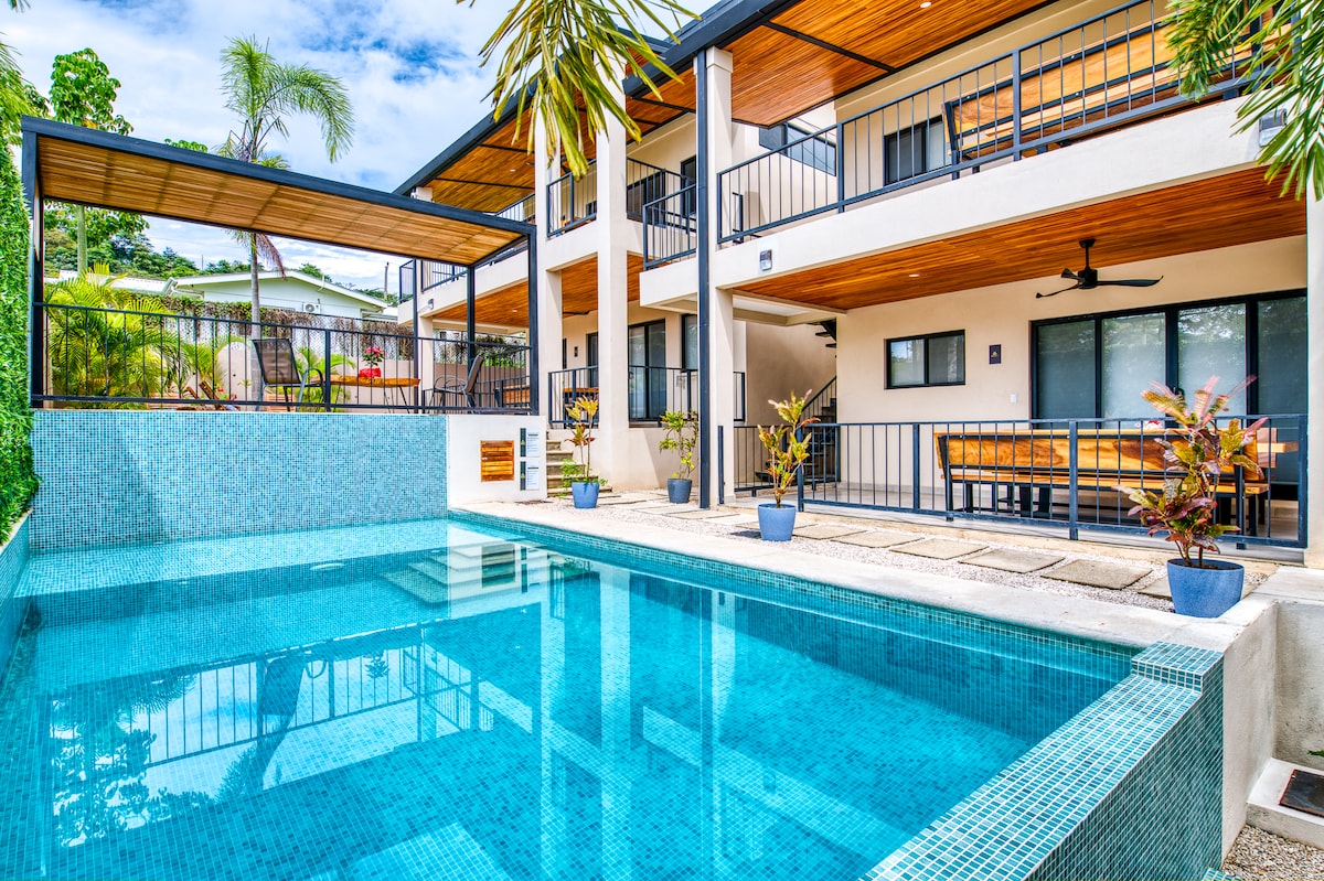 Immersed in nature, this is a brand new stylish and modern unit. Detailed with an exclusive rustic touch, we offer a unique dine and wine experience in our magical treetop terrace. Located downtown, yet in a quiet neighborhood, you will find yourself 5 minutes away (walking distance) from the pristine beach of Tamarindo. 2BR / 2BA, AC, fully equipped kitchen, terrace, outdoor treetop dining experience, free parking on premises. Take it easy at this unique and tranquil getaway.
