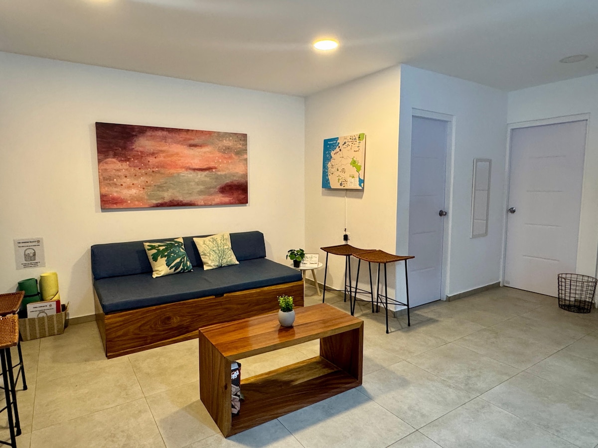Welcome to our charming rental studio nestled in the heart of Tamarindo, just a 10-minute walk (1 km) from the beach. This fully equipped studio offers a private bathroom, a refreshing salt water swimming pool only shared with main house, and high-speed 200 Mbps internet connection.. Relax in a queen bed and a comfortable sofa bed, a smart Tv for entertainment, and an outdoor terrace where you can enjoy your meals. Stay cool and comfortable with both a fan and air conditioning provided.