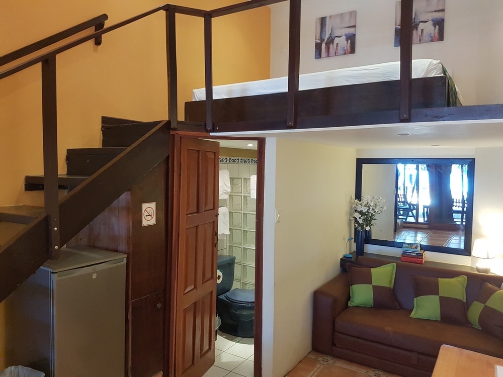 You cannot beat the location of this brand-new beachfront loft! It is located directly in front of the best surf break in Tamarindo and only a couple minutes walk to the center of town! Each loft suite has a downstairs sitting area with a futon and a full spacious bathroom. Walk up the floating teak staircase to your loft featuring a luxurious King size bed! The loft is modern, but the beachy design offers all of the top amenities and more than you could ask for! Pura Vida at its finest :)