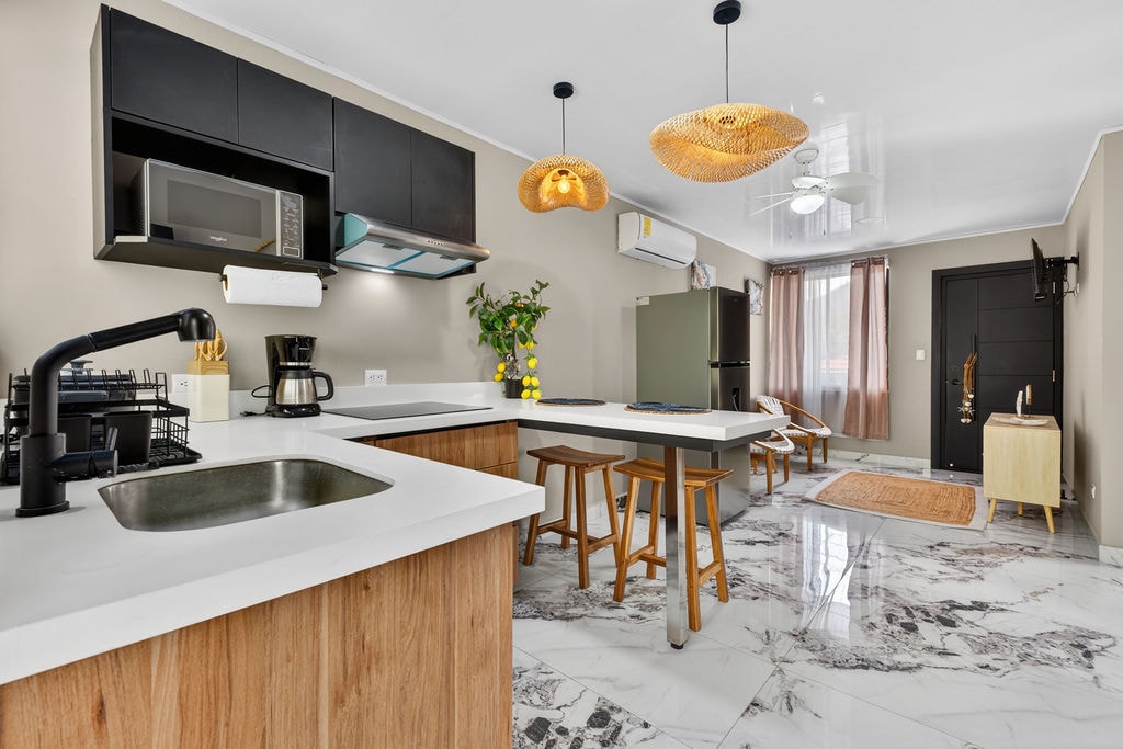 Immersed in nature, this is a brand new stylish and modern unit. Detailed with an exclusive rustic touch, we offer a unique dine and wine experience in our magical treetop terrace. Located downtown, yet in a quiet neighborhood, you will find yourself 5 minutes away (walking distance) from the pristine beach of Tamarindo. 2BR / 2BA, AC, fully equipped kitchen, terrace, outdoor treetop dining experience, free parking on premises. Take it easy at this unique and tranquil getaway.