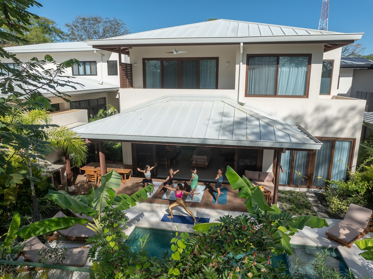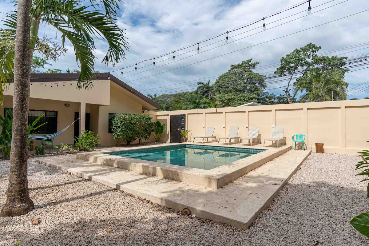 Apartamento equipado con todo lo que necesitas para corto o largo plazo de estadía. Internet rápido, ubicado en una rotonda residencial tranquila donde casi no circulan autos. A 300 metros de la playa, restaurantes, banco, supermercado, 100 metros del gym super céntrico. Puedes salir en la noche y volver caminando. Es normal ver en el patio, iguanas, monos aulladores, zorritos, Aves, ardillas etc. Los huespedes tiene descuentos en el surf shop Club 33 y además te ayudare a recomendarte otras act