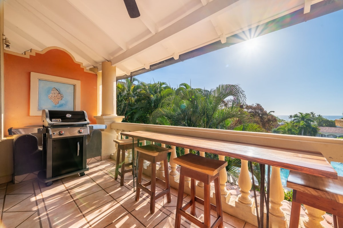 Bright 2 bdrm, 1 bathroom ocean view Tamarindo Diria condo. Just renovated with sleek kitchen, bathroom with big shower, new sofas and linens and long terrace with BBQ and bar - perfect for soaking in the views. Enjoy the fantastic lagoon pool with swim-up bar. Great location on a quiet hill inside the Diria resort, steps to the beach, shops, restaurants and activities. Secure parking. Start your Tamarindo vacation!