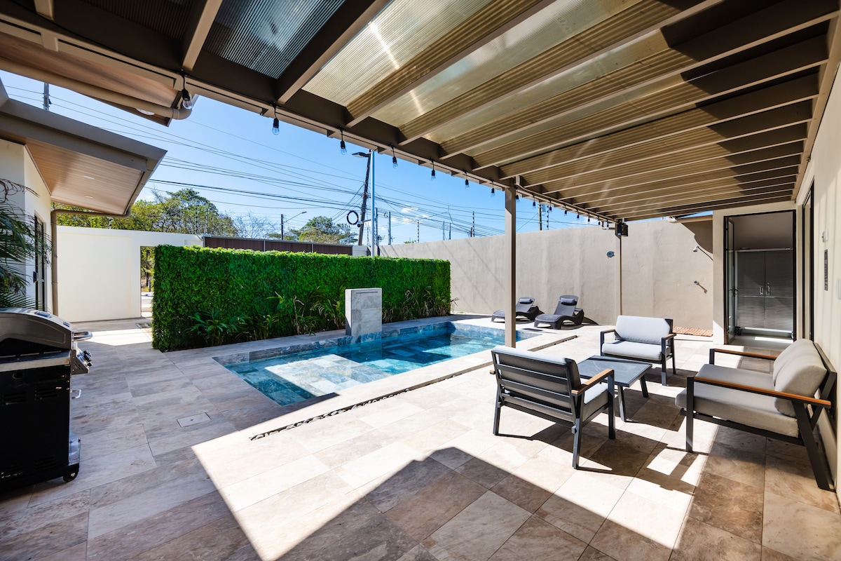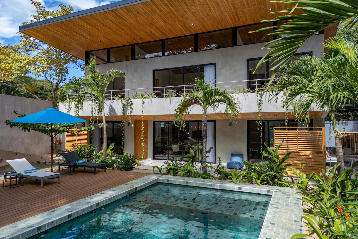Villa Enrico - Beautiful standalone villa just 100 meters walk from Playa Langosta in Tamarindo. Features a private pool surrounded by beautiful landscaping, sun terrace, BBQ area with outdoors dining, and open-concept living with a large kitchen island. Includes 3 bedrooms, 2 full bathrooms, AC throughout, private parking for 2 cars, 2 bikes, laundry area, and complimentary concierge services. Perfect for up to 8 guests. Great location with quiet surroundings and just a short walk to Tamarindo