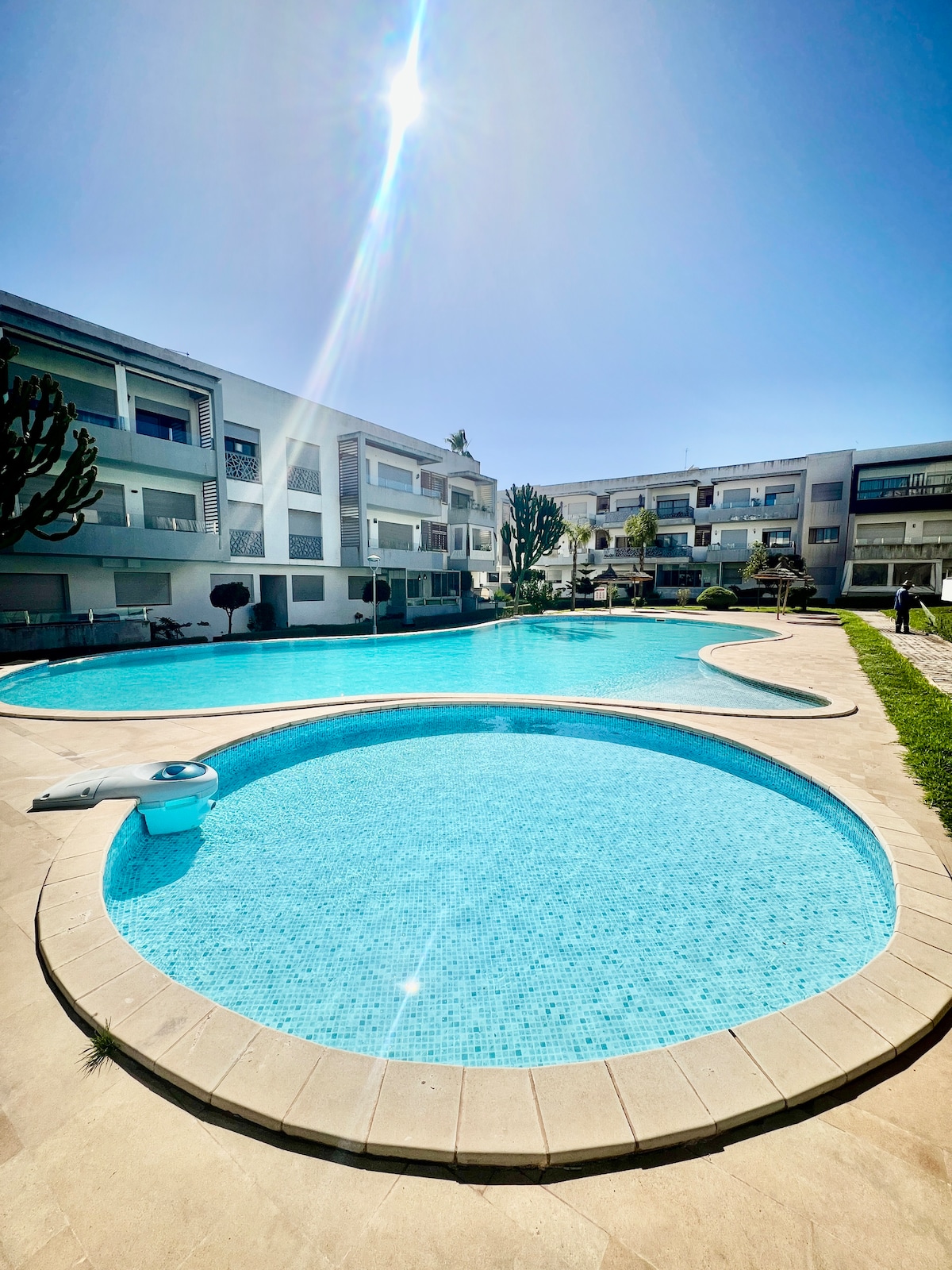🏡 Appartement Cosy de 120m²📍 Dar Bouazza, à 20 min de Casablanca et 1 km de la plage 🌊 🛏️ 2 chambres avec TV (Netflix/Prime) 🛁 2 SDB 🛋️ Grand salon marocain contemporain 🌅 Terrasse aménagée avec TV, canapé et vue sur la piscine 🏊♂️ 🌴 Résidence sécurisée avec piscine, palmiers et oliviers 🌳 ✨ Idéal pour un séjour détente en famille ou en couple 💑 🛍️ Proche mer et commodités!