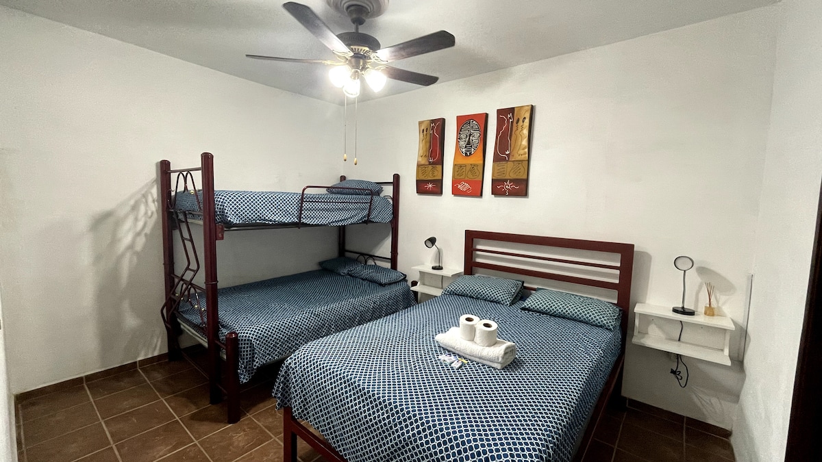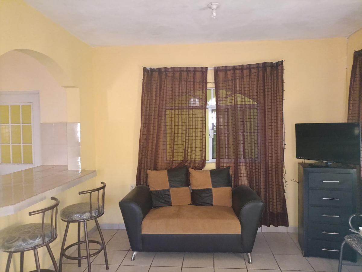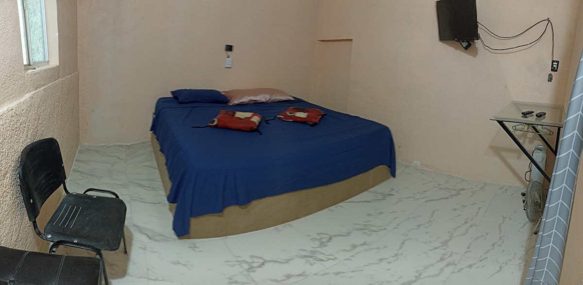 Departamento para descansar, con ubicación céntrica y económico. Cuenta con cama king y wi-fii, un abanico de piso, un closet, una plancha, baño completo, 1 cocina semintegrada con parrilla electrica, airfryer y un horno pequeño, utensilios de cocina y tarja de agua caliente y clima.
