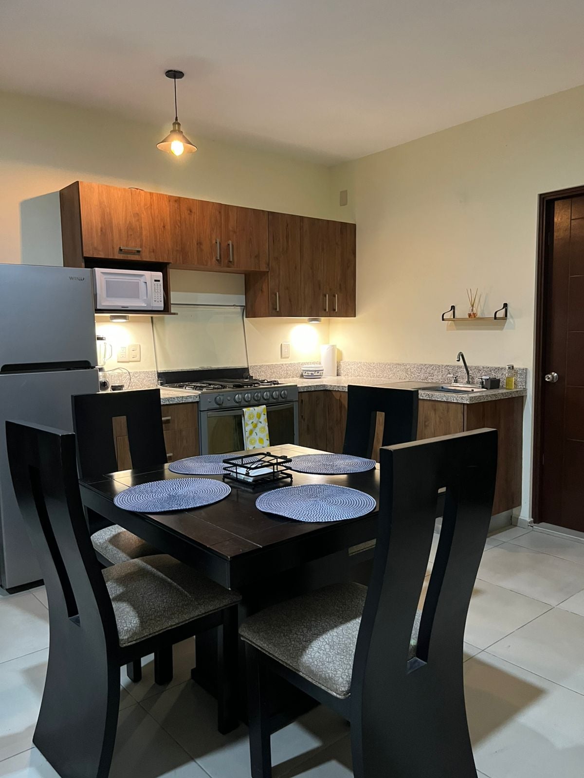 Departamento independiente, colchón King Sice, cocina integral, refrigerador, parrilla doble, campana extractora, microondas, cafetera, tostador, licuadora, vajilla, sartenes, cubietos, botellón Ciel, sal, pimienta, aceite, café, azúcar y leche. Tabla, cuchillos, secadores, plancha y burrito. Sala TV-IZZI, A/C, WIFI, baño completo con agua fría y caliente, toallas, secadora de pelo, papel sanitario y de cocina, shampoo p/pelo, cuerpo y manos, artículos de limpieza, cochera techada y cerrada.