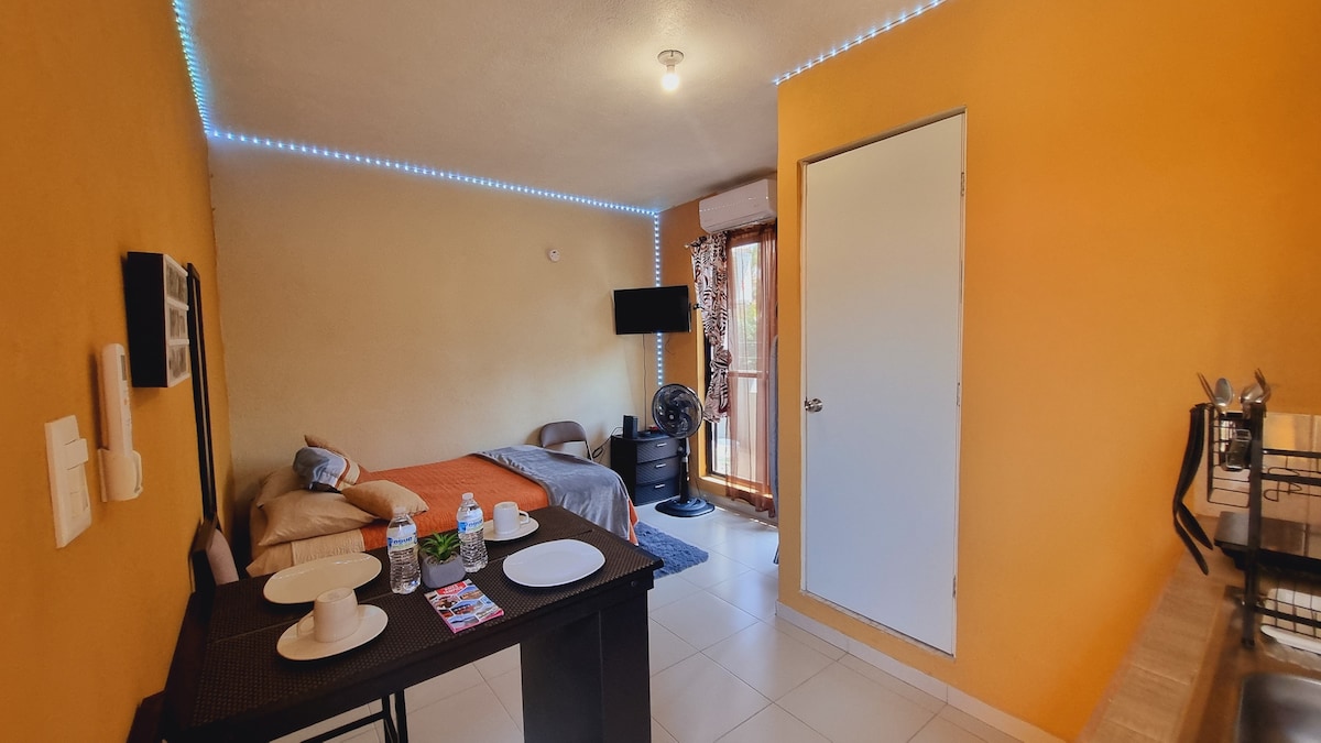 Disfruta de la sencillez de este alojamiento tranquilo y céntrico. Con el espacio ideal para disfrutar de forma individual o con tu pareja, dónde puedes descansar, preparar tus alimentos y asearte cómodamente. Ademas de contar con supertienda, refaccionarias, oxxo, gasolinera y restaurantes de comida rápida a pocas cuadras.