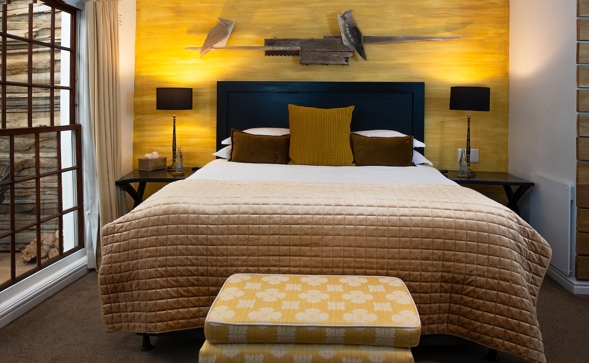 Welcome to our king size luxe suite, designed with a minimalist style. The room features a luxurious kingsize bed, a private ensuite bathroom with a lovely shower, and a desk to work with high-speed internet. Take in spectacular views of Table Mountain from your bed and enjoy streaming your favourite shows on the Smart TV. Essentials like an iron, bathroom amenities, hangers, and a hair dryer are all provided. Guests can also make use of our shared, fully equipped kitchen and dining area.