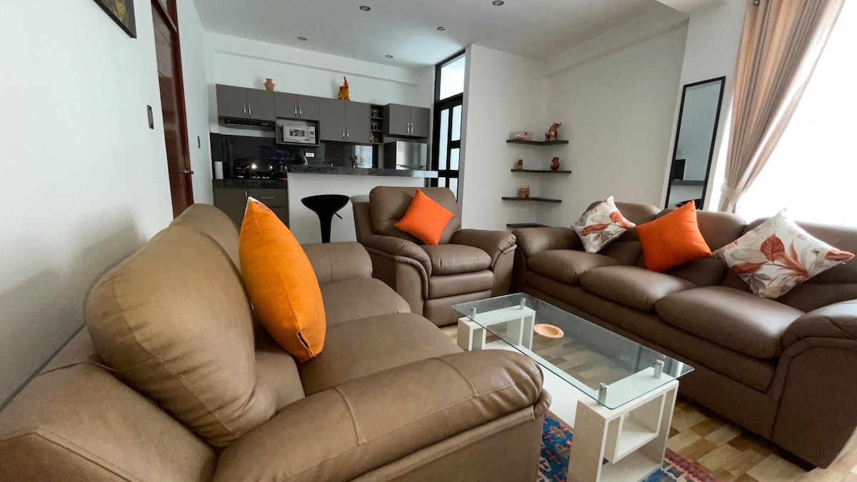 Este hermoso Airbnb ofrece un Departamento duplex entero,amplio y muy acogedor con una habitación con cama king size para un buen descanso,baño en la habitación, tiene muy buena iluminación y ventilación,está en un 4to piso de acceso por escaleras. Cuenta con ambientes como sala,comedor,cocina completamente equipada(tiene una hermosa isla) terraza y lavandería. Está en una zona centrica,cerca al terminal,tiendas,mercados y Plaza de Armas,excelente punto de partida para visitar lugares turisticos