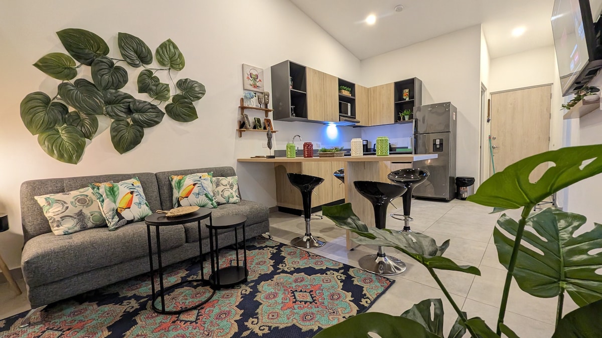 Absorb the charm and rhythm of beautiful Mal Pais. Our spacious penthouse is set back in a tropical oasis with a cozy indoor setup which opens up to a huge tropical pool view balcony. Walk to the beautiful beaches and tide pools. Near the best surf spots! Quiet location, yet a short 10 min drive to downtown's main bustle where you'll find excellent dining options and a fun nightlife. Grocery store, brewery and pizzeria around the corner. Purified water on tap! Fiber Optic WiFi ⚡️ 100 Mbps