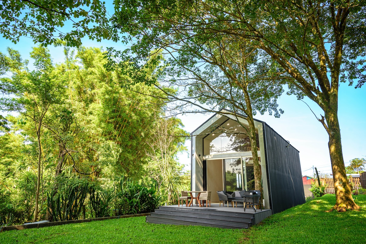 BLACK TI, a two-bedroom, one-bathroom luxury black cabin, nestled in a 200-acre farm in the Poas Costa Rica region, is a perfect getaway for couples or small families. The cabin is surrounded by nature and farmland, it offers stunning views of the Poás Volcano and the Central Valley. It features a number of amenities, including a Finnish sauna, hanging bed,fire pit, BBQ, hammocks, kids house, and fireplace. The cabin's name is inspired by Cordyline fruticosa, a tropical plant with black leaves.