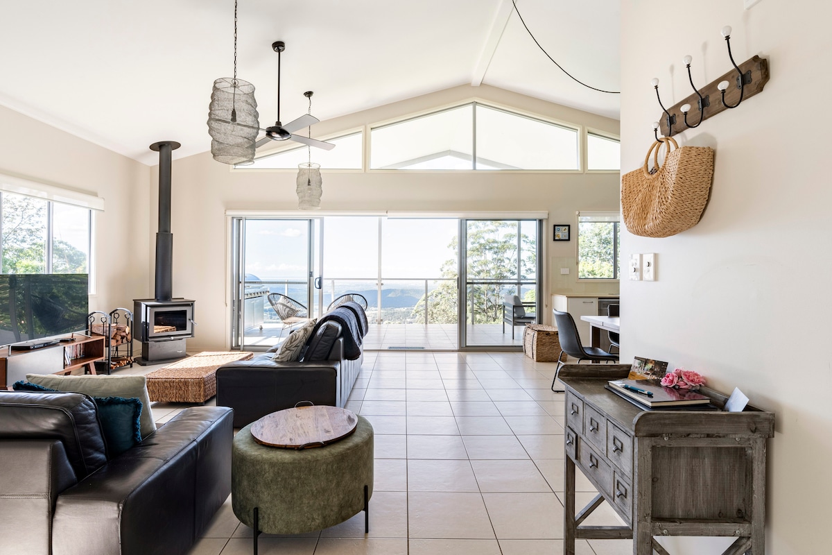 Ocean Views to the Gold Coast and only meters walk to the pristine golf course. Relax and unwind on the expansive deck overlooking Tamborine Mountain to the magical view of the Pacific Ocean taking in the high rises of the Gold Coast. The ever changing views from stunning sunrises to sparkling night lights of the Gold Coast will take your breath away. If you can drag yourself away from the deck you can enjoy a cosy indoor fireplace or the fire pit set amongst the tropical rainforest garden.