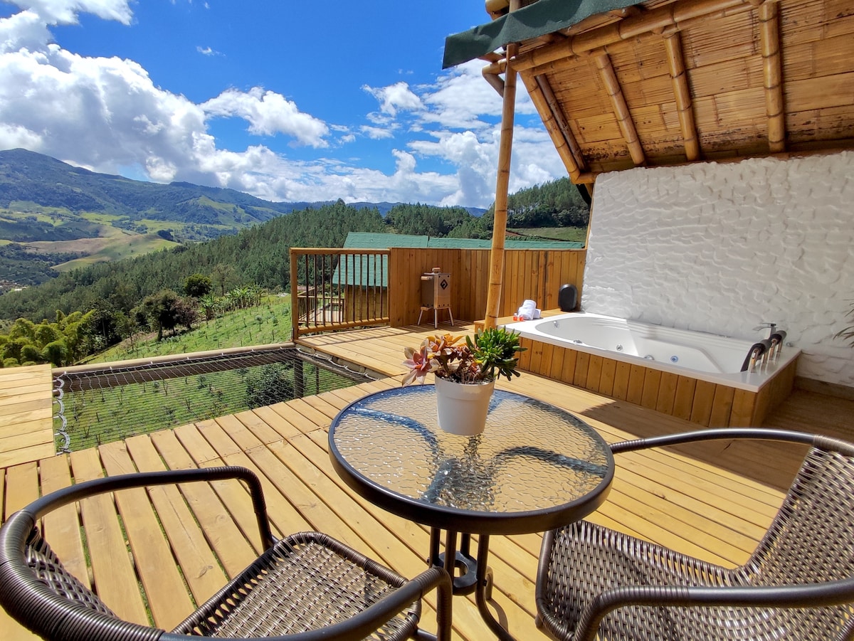 Un rincón mágico con tres glamping, sobre un deck de madera que respeta la geografía natural; incluye una cama doble, baño privado, agua caliente, preparación bebidas calientes, catamarán al lado de glamping y una zona inferior con hamacas y una silla doble con cojines, todo para disfrutar de los sonidos del río, los cantos de las aves o las estrellas al caer la noche. Además, se cuenta detalles artesanales y elementos cuidadosamente seleccionados para crear un ambiente acogedor y reparador.