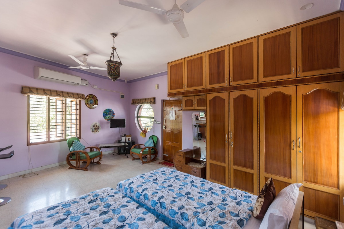 First floor , One Air Conditioned room ( extra charges based on actual AC usage ) with 2 cots and Sleepwell mattress , with private bath , 24 hours hot water, UPS battery back up for lights and fans only (for about 4 hours), Fiber WiFi , fridge , small kitchenette with single burner lpg stove, few utensils , electric kettle,washing m/c , EV charging point.