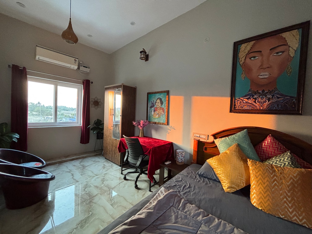 Spacious, calm villa near the beach & UNESCO monuments. Well suited for families, friends, and group stays who value space, breeze, & a relaxed atmosphere. • 4 A/C bedrooms with attached bathrooms • Extra mattresses available • Fully equipped kitchen for cooking • Tropical garden, sit-out hut & large breezy terrace • Plunge-style mini pool (for sitting & splashing) • Private parking for 5 cars, 24/7 CCTV Pet-friendly & unmarried couples welcome. Decorations on request. Food delivery available.