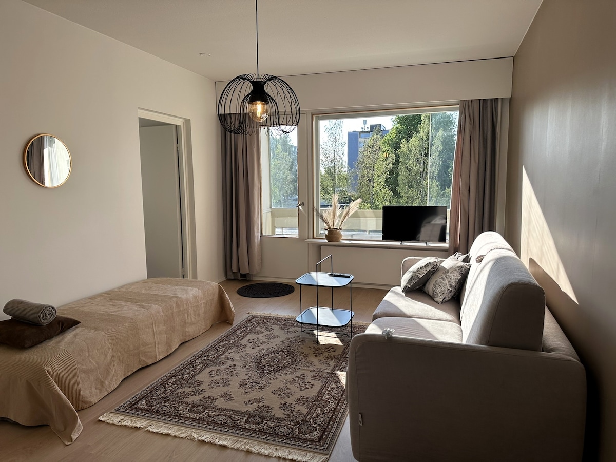Kaupungin ydinkeskustassa valoisa kerrostalokaksio aurinkoisella parvekkeella. Makuuhuoneesta löytyy 1x 90cm jämäkkää runkopatja sänkyä. Toinen 90cm leveä runkopatjasänky on olohuoneen puolella. Lisäksi olohuoneen sohvan saa muutettua 120cm x 190cm vuoteeksi. Kohteessa omatoiminen sisäänkirjautuminen ja avain avainkaapista. Matkaa täältä on torille ja linja-autoasemalle 100m. Talossa on hissi ja esteetön sisäänkäynti taloon löytyy talon takapihan kautta.
