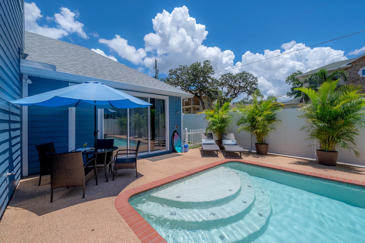 Welcome to Queen bedroom Carriage house. A stand-alone retreat with no shared walls. This charming accommodation features a fully equipped kitchen & bathroom, a Smart TV, and off-street parking for one car. The kitchen window offers a delightful view of the waterfall in the lagoon, creating a serene atmosphere. Explore the surroundings with the two bicycles included in your stay. You're just 1 mile away from spa Beach and within 8 miles of the stunning shores of St. Pete or Treasure Island.