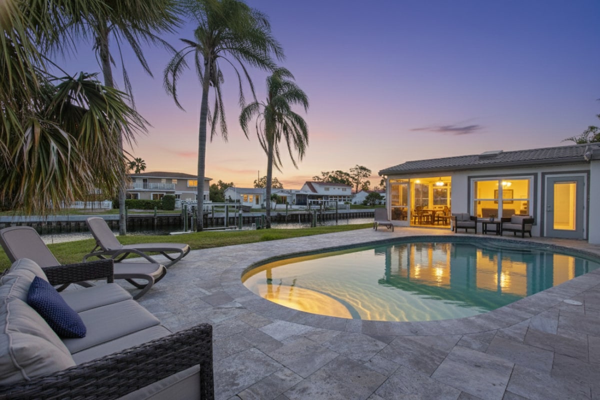 Relax at your waterfront oasis in Apollo Beach with a private pool, kayaks, and sunset views. Spot dolphins and manatees from the backyard or unwind on loungers with outdoor dining and games. Inside: full kitchen, dining area, 2 bedrooms, 2 baths, plus an extra living room with sleeper sofa and closet that serves as a 3rd bedroom. Close to Tampa, beaches, dining, and family attractions — ideal for families, friends, or a romantic getaway in a spacious private home. LIC# DWE3913431