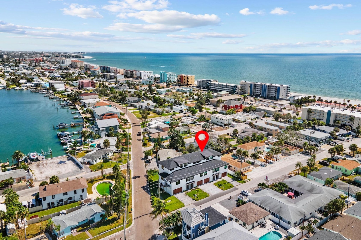 Luxurious 3BR/3BA fully furnished new home that sleeps 11. Enjoy the gorgeous ocean views with two large balconies, perfectly located across the street from the beach, Caddy's restaurant and walking distance to several diverse options, and a 15-min walk to John's Pass (jet skis, fishing, restaurants, and more!) Amenities: - Smart TVs in all rooms - Fully equipped Kitchen - Gas grill - Beach accessories - Board Games - Family friendly
