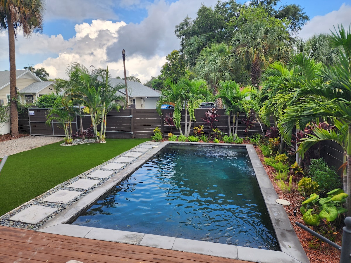1925 Bungalow, 3 bedrooms, saltwater pool, private backyard/large deck. In the perfect location to explore the best of Tampa, including: Tampa International Airport-4.7 miles Armature Works/Riverwalk-.9 of a mile University of Tampa-1.5 miles Downtown Tampa-2.1 miles Raymond James Stadium-2.4 miles Ybor City Historic District-2.3 miles Amalie Arena/Channelside-2.6 miles USF-9.2 miles Clearwater Beach-25 miles Disney World-1 hour The Bungalow is on a busy main road & the pool is not heated.
