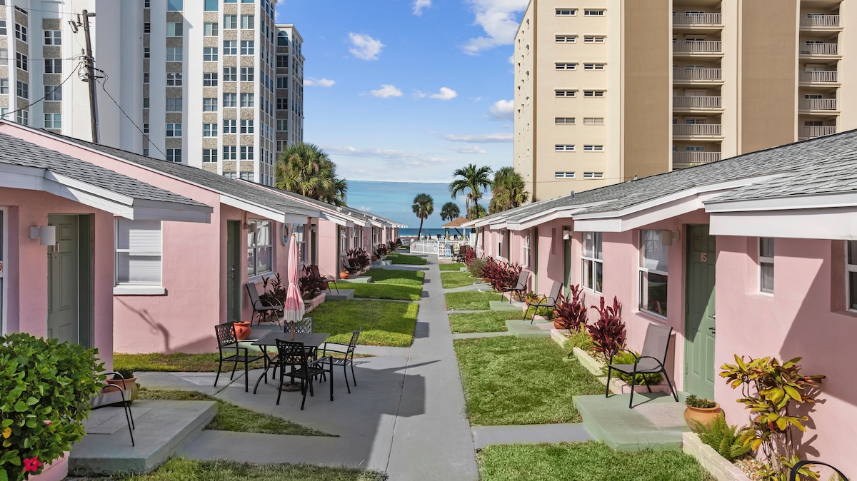(If your dates aren't available, we have other units on-site and elsewhere, including studio, 1 and 2-BR layouts!) 200 Yards to Beach! Sun, sand & a sparkling pool await. Free parking & speedy Wi-Fi included. Inside: Cozy mini-cottage, queen bed, AC, smart TV & full bath. Outside: Heated pool, BBQ grill & easy beach access. Beach towels Coin laundry On-site concierge Love it? Hit “Book” before the dates go!