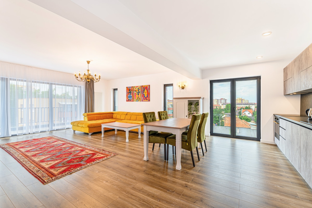 Spacious 2-Bedroom Apartment with Panoramic Views in center of Brașov: This apartment is situated on the 8th floor of a classic building and boasts an amazing panoramic view of Brașov's old town, and 2 steps to AFI mall. The space includes: - Two bedrooms; - Two modern bathrooms; - A large, fully equipped kitchen ideal with living space; - A large kitchen with living area. Big windows with amazing city views. Perfect for short or long stays, with everything you need for a comfortable visit!