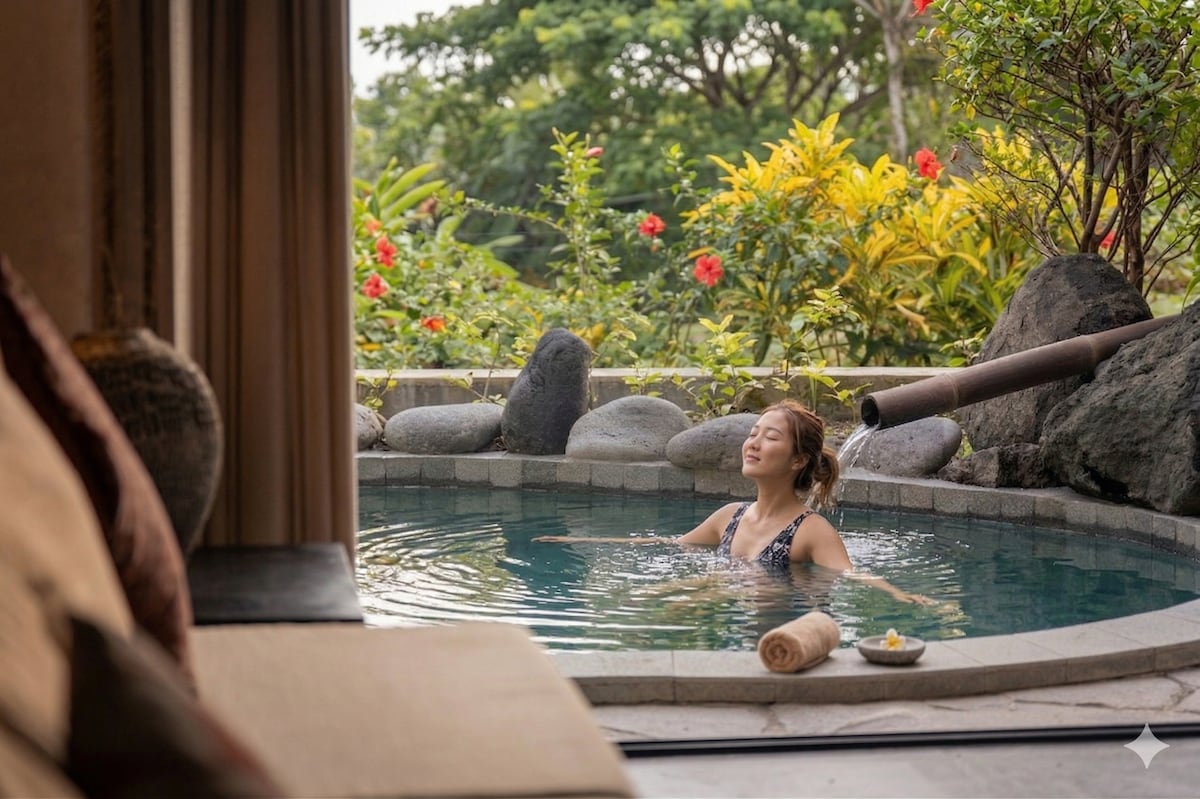 迷人的房间,阳台上有浴缸,可欣赏泳池景观