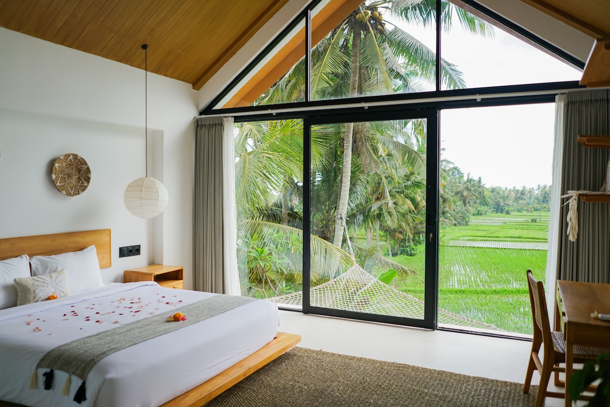 Brand New Wooden Cozy beautiful villa with amazing view at rice field nestled in the heart of lush rice fields of Ubud. Offers you an unforgettable vacation & stay, surrounded by a soothing green expanse and breath-rice paddy views. You'll be welcomed by a calm and green atmosphere of ubud rice field. Spacious room and directly overlooking the rice fields, allowing you to enjoy the beauty of nature from the comfort of home. Elegant wooden decor and natural feel create a warm & cozy atmosphere.