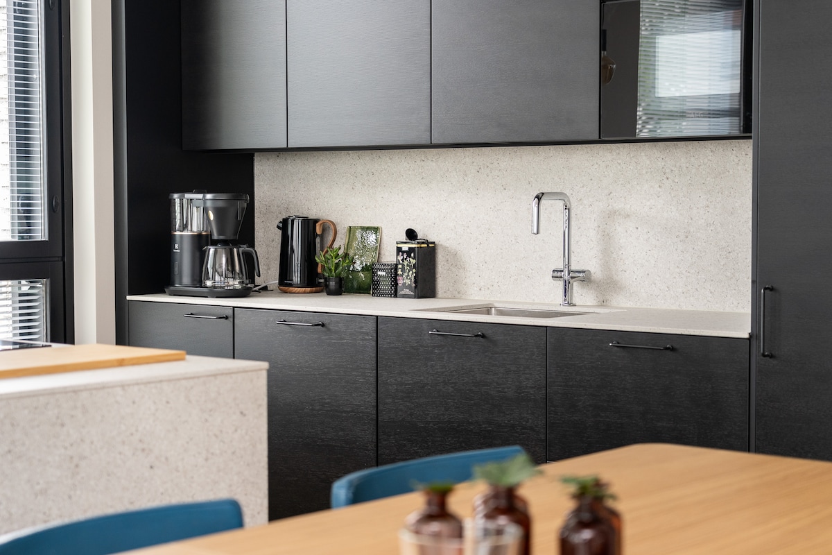 New cozy air-conditioned 74.5 m2 2BR apartment with sauna in Tammela Stadium. With elevator you can access parking hall, supermarket and restaurants. There is 1 free parking spot in the parking hall and public transport is just around the corner. City center is also nearby (1km). The apartment has high-quality materials and equipment, fast Wi-Fi and 65" TV with Netflix, as well as a large balcony with park view. This place is good for business travel or for relaxing break from everyday life.
