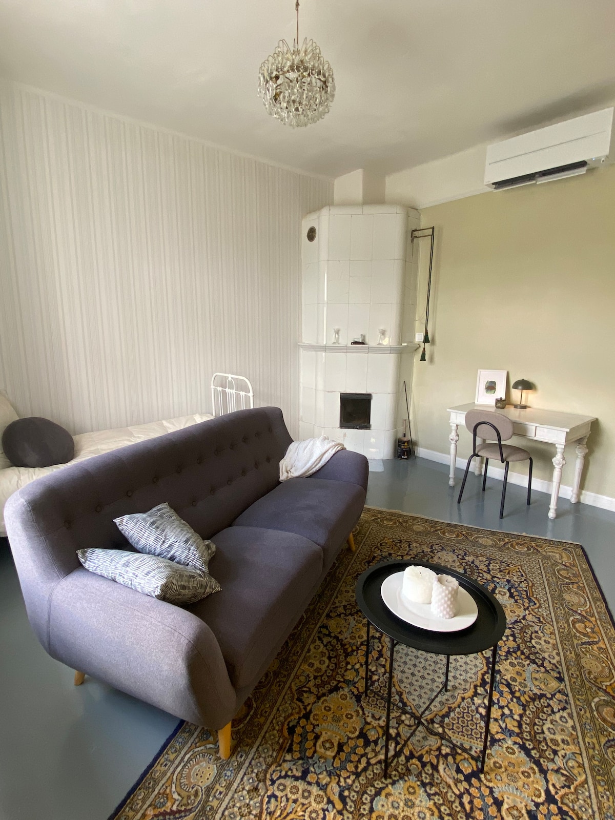 Enjoy stylish accommodation in the heart of Tampere, in an almost 100-year-old building! The completely modern 40m2 apartment breathes history with small details: wide window sills, original doors and thick walls. A stylish glass wall separates the bedroom, but does not limit the spacious view of the apartment. The modern kitchen has all the necessary appliances, including an espresso machine. The apartment is located in the centre, next to Nokia Arena and Ratina shopping center. Welcome!