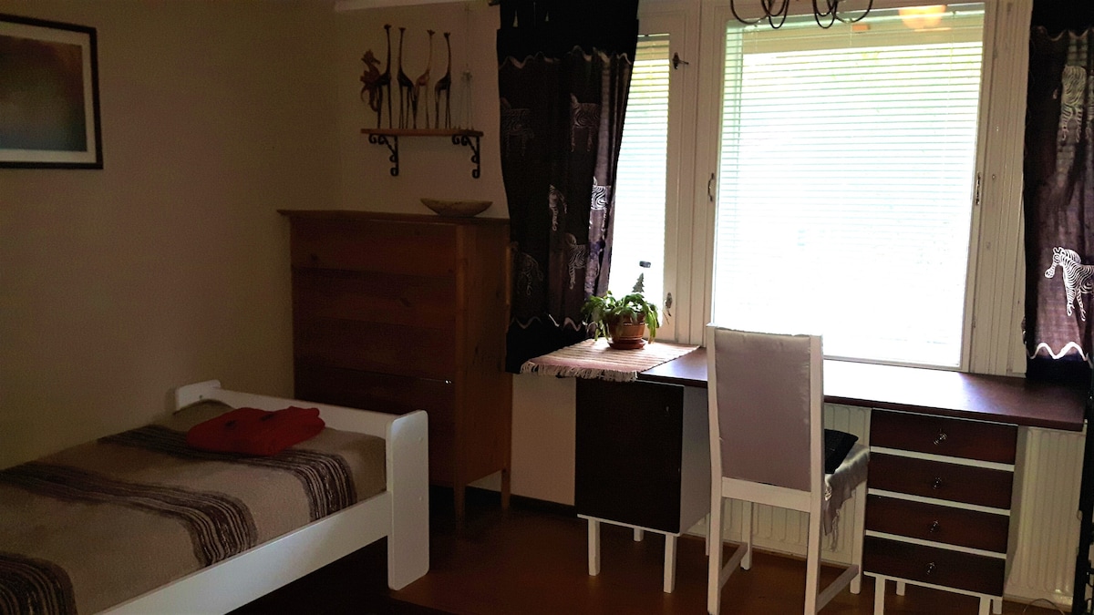 Peaceful, functioning cozy home set amongst the traditional wooden houses and apple trees of Petsamo. Feeling of old times with modern basic needs in a perfect location near city center, forest area of Kauppi, Lake Näsijärvi and Areena. Viihtyisästi sisustettu huoneisto rauhallisella ja idyllisellä puutaloalueella lähellä keskustaa. Asunnossa on erillinen keittiö, wc/kylpyhuone, eteinen, makuualkovi parivuoteella ja olohuoneessa vuodesohva. Soveltuu perheillekin. Areenalle bussilla 26 5 min.