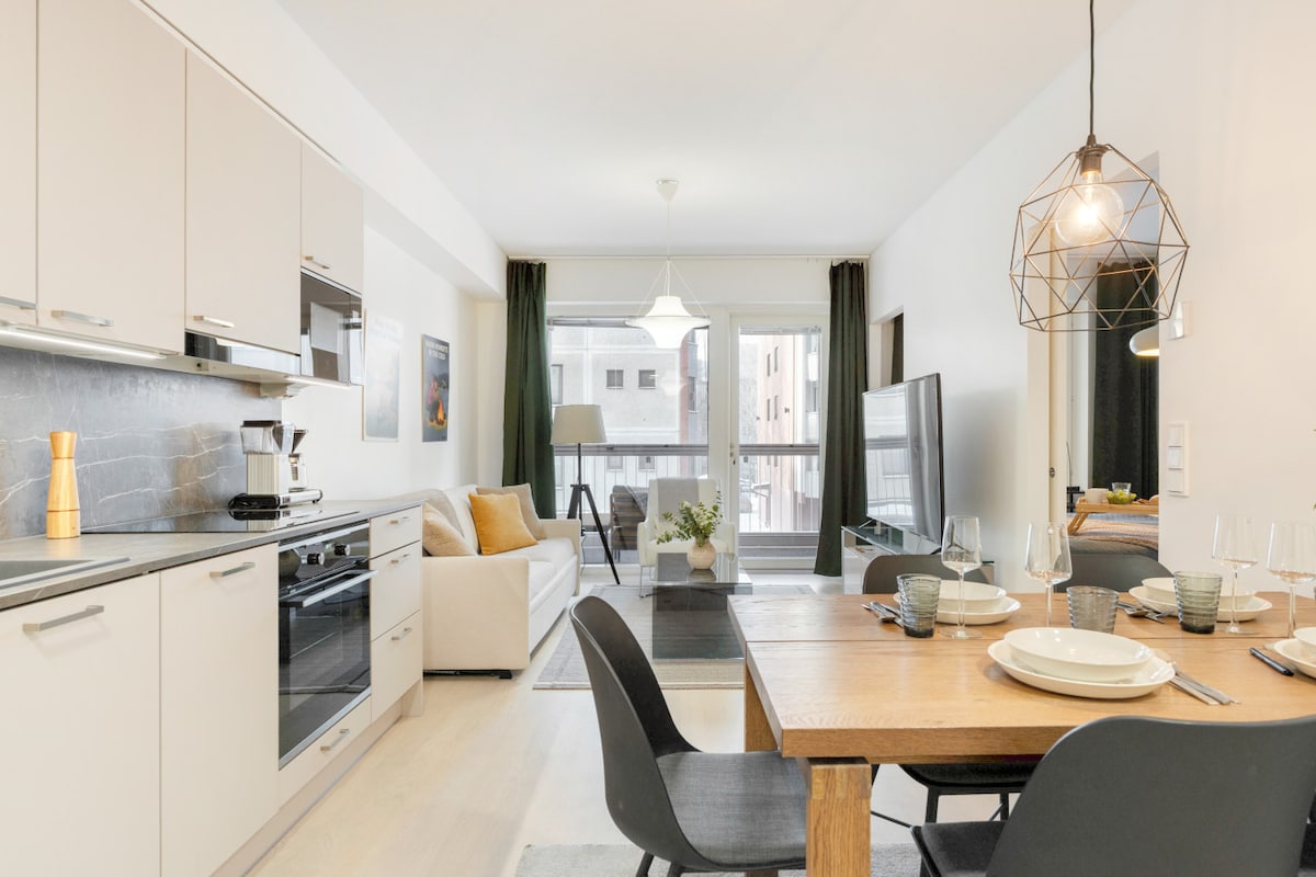 Enjoy a comfortable accommodation experience in this new apartment in a new residential area in Santalahti. Own parking space in the parking garage under the building. The kitchen has all the basic equipment for cooking. Only three kilometers from the center of Tampere. The trip to the center takes only 10 minutes on a tram. Tram stop is only 200 m away from the apartment. 1.5 km from the amusement park Särkänniemi. 300 m to Santalahti's large lakeside park. Fast and reliable 100 Mbit internet.