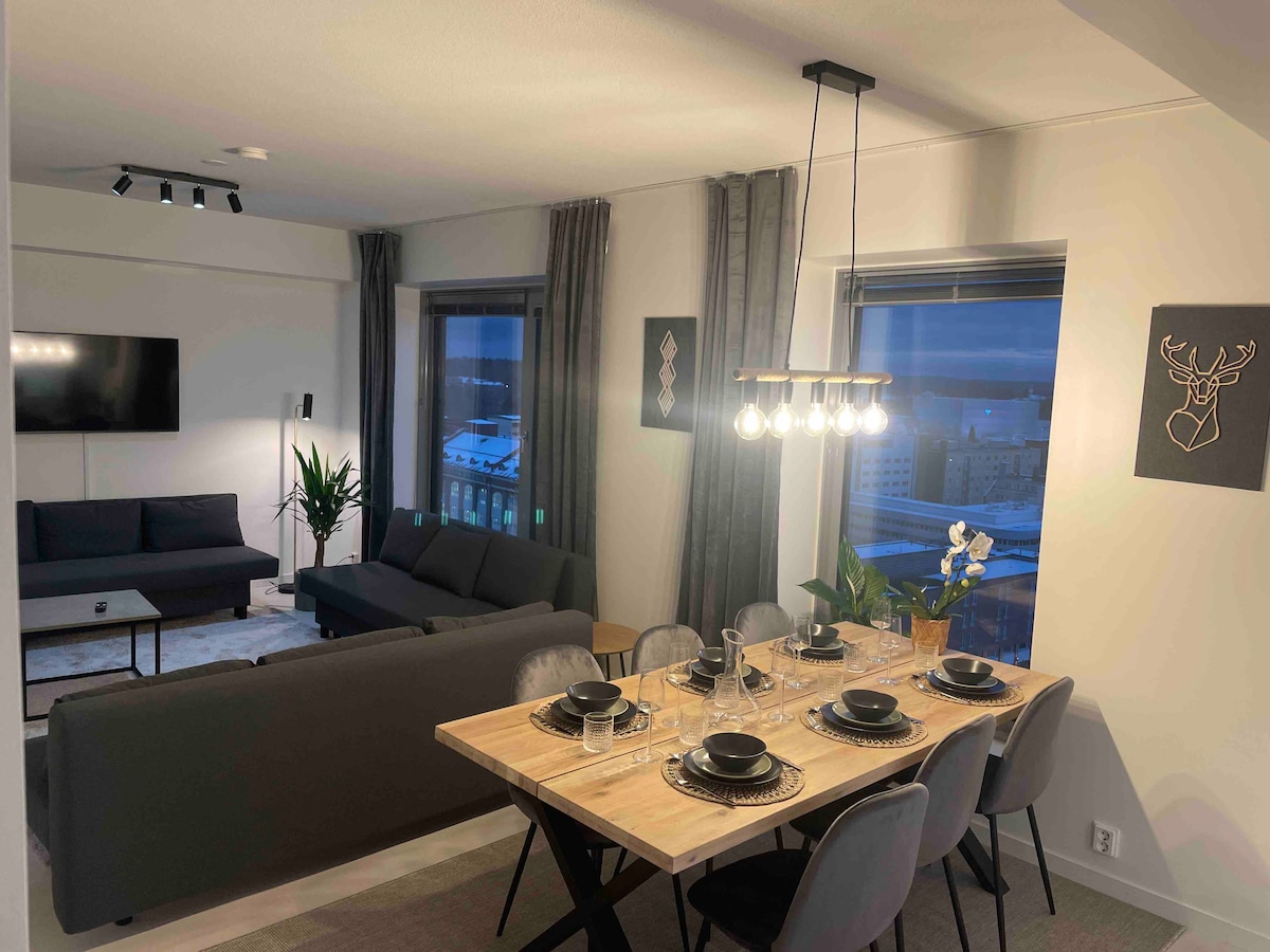 Hulppea asunto sijaitsee aivan Tampereen ydinkeskustassa, kaupungin korkeimmassa kerrostalossa. Talo on rautatieaseman vieressä sekä varaukseen sisältyy myös ilmainen autohallipaikka, joten pääset asunnolle helposti millä tahansa kulkuvälineellä. Asunnosta löytyy kattavat mukavuudet jopa kahdeksalle henkilölle, joita ovat esimerkiksi pyyhkeet ja lakanat, upea saunaosasto kylpyhuoneineen, asunnon viilennin sekä laadukkaat tarvikkeet. Hulppea näkymä sekä paras sijainti kruunaavat kokemuksesi!
