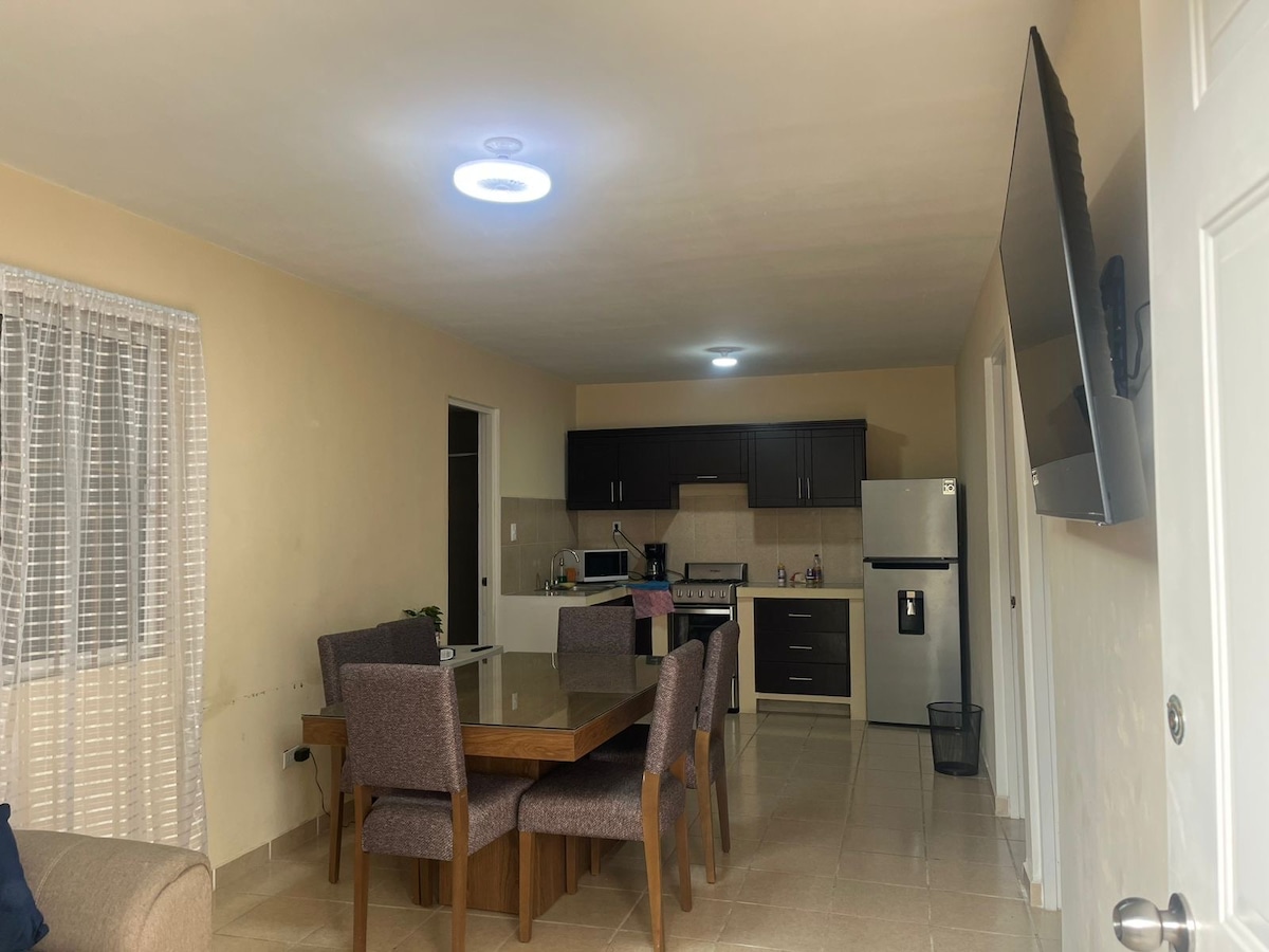 Cómodo departamento, espacio abierto con todo lo necesario para una estancia agradable. Consta pequeña, pero funcional cocina, comedor, cama matrimonial, sofá-cama, 1baño completo, plancha, estufa, refrigerador, alacena, microondas, licuadora, cafetera, utensilios, boiler, minisplit, Smart t.v, wi-fi, abanico de pedestal y Entrada Independiente. A dos cuadras y media de la carretera Tampico- Mante, buena ubicación,de 6 a 8 minutos del aeropuerto de Tampico.