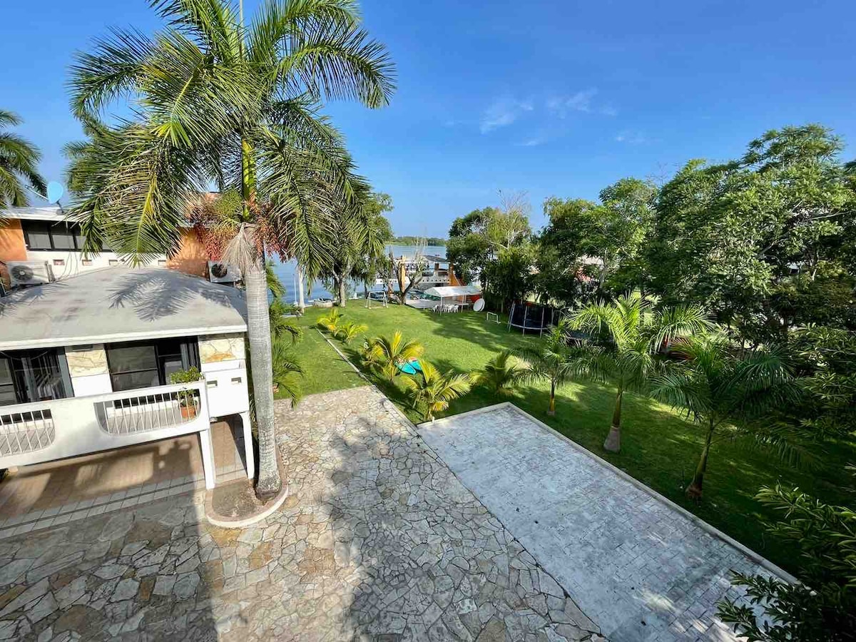 Villa #6, a 10m de la hermosa Laguna de Chairel, planta baja-cocina, sala, comedor, bar con barra para servir, 1/2 baño, jardín y asador privados, 2 cocheras techadas; planta alta-4 recamaras Standard, 4 baños completos; tercer piso-1 recámara Grande, 1 baño completo, con una terraza con vista directa a la Laguna de Chairel, hasta para 14 adultos en cama, mas 4 niños con sus papas. Ideal para descansar en un ambiente familiar de paz, seguridad y respeto.