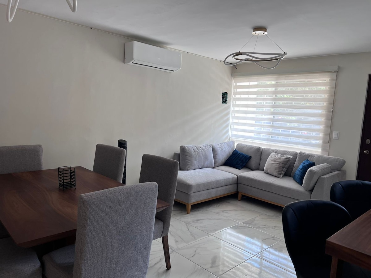 🏡 Acogedora casa en fraccionamiento seguro 🔐 🛏️ 2 recámaras con minisplit, abanico de cielo y 📺 Smart TV (Netflix) — Recámara 1; 1 cama matrimonial 🛌 Recamara 2.- 2 individuales 🛏️. 🚿 1.5 baños | 🛋️ Sala con Smart tv| 🍽️ Cocina equipada con refri, microondas, horno eléctrico, cafetera y utensilios. 🧺 Cuarto de lavado con lavadora y secadora. 🚗 Estacionamiento para 1 auto y entrada autónoma 🔑. Ideal para familias o estancias de trabajo.
