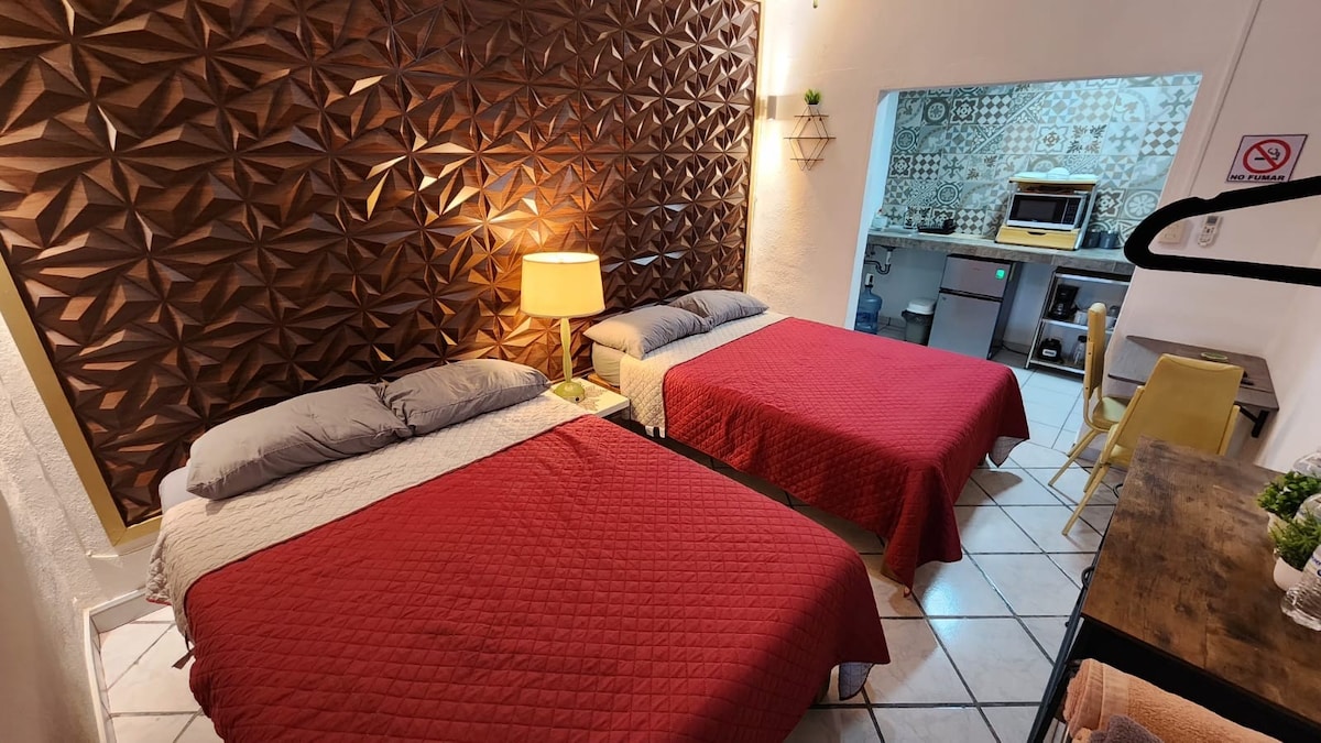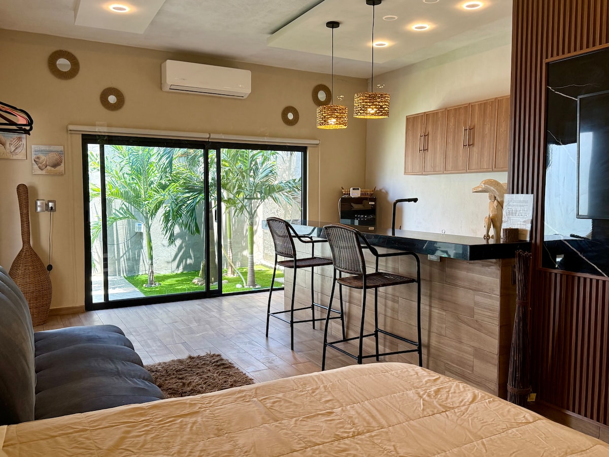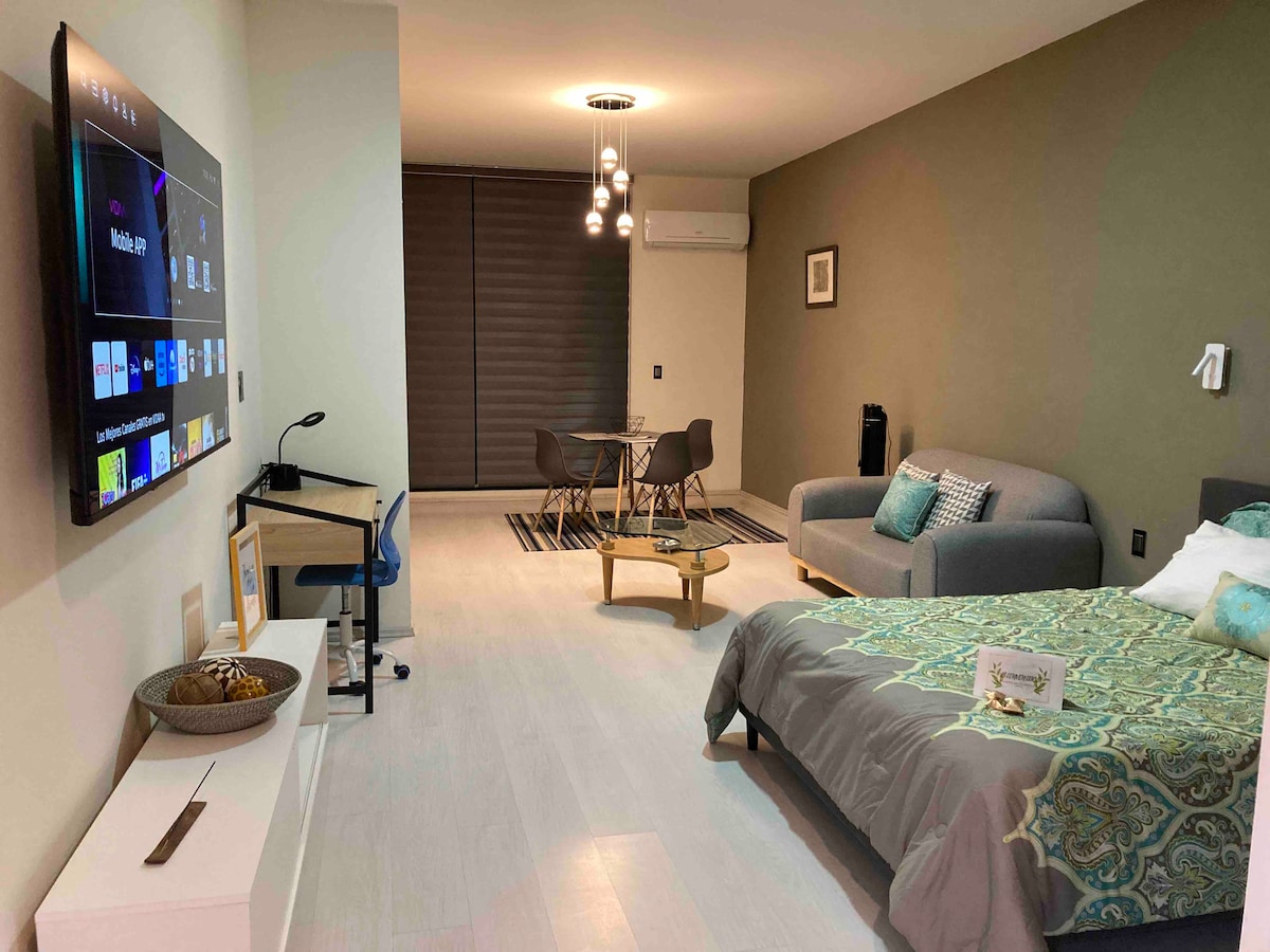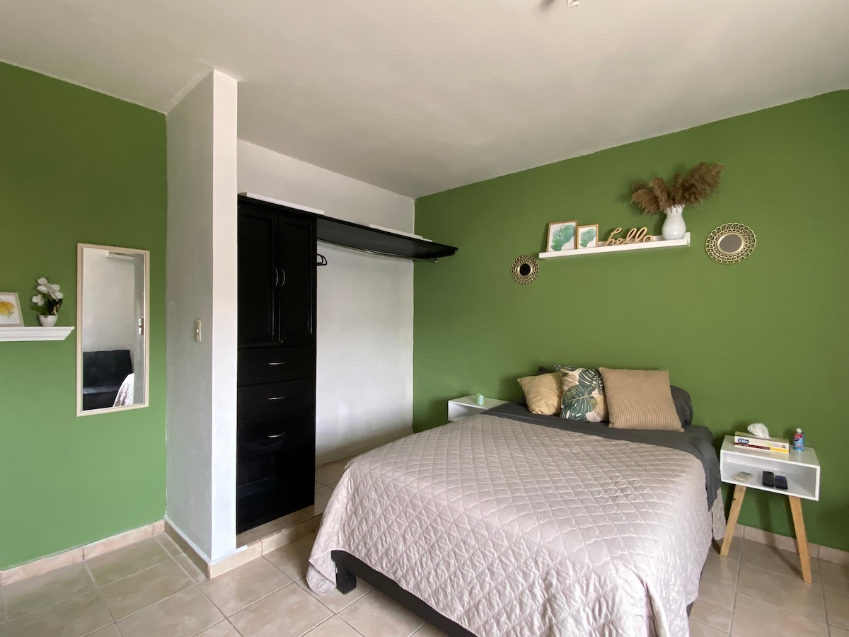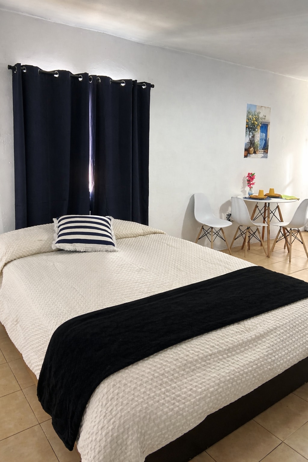Mini departamento confortable y moderno en planta baja, ubicado en colonia residencial a espaldas de la UAT, a 20 minutos de la playa y centro de espectáculos en la laguna del carpintero. Cuenta con cama matrimonial, área de trabajo con wifi, baño privado, aire acondicionado, cocina con frigobar y horno de microondas. Entrada independiente autónoma. Se emiten facturas